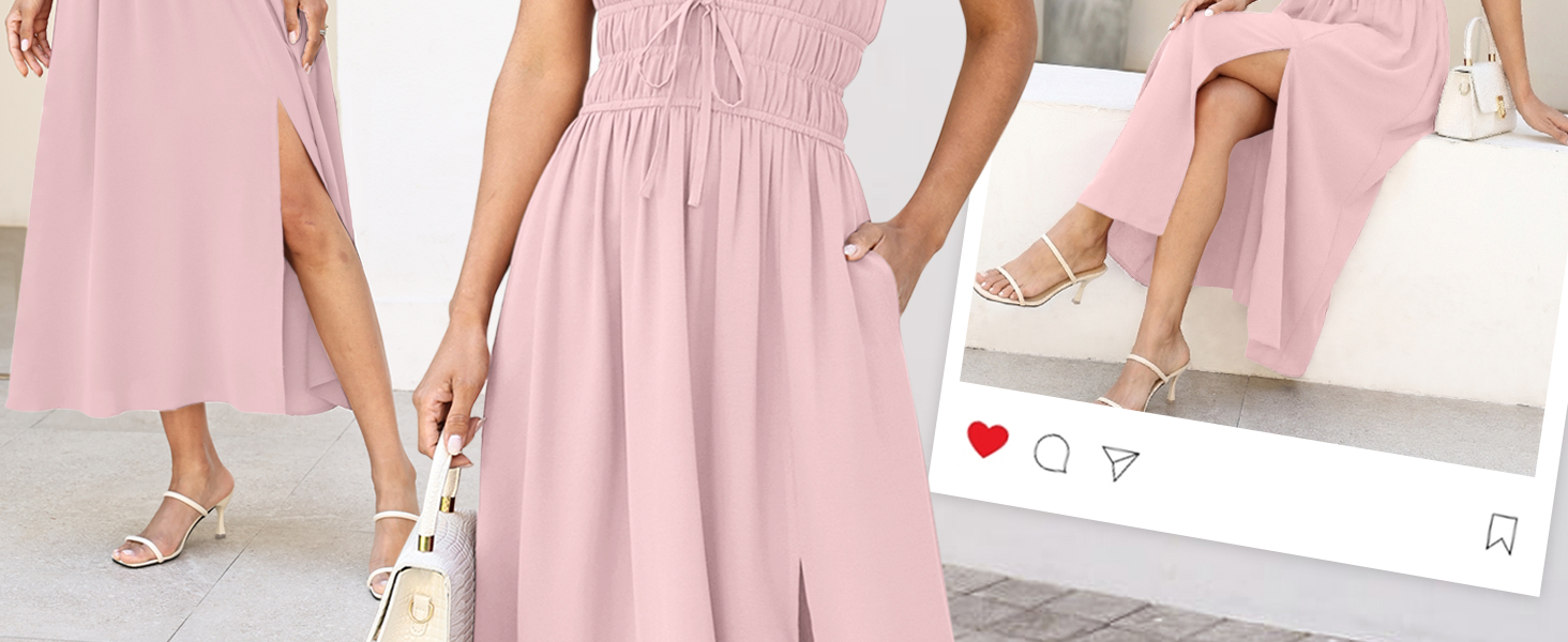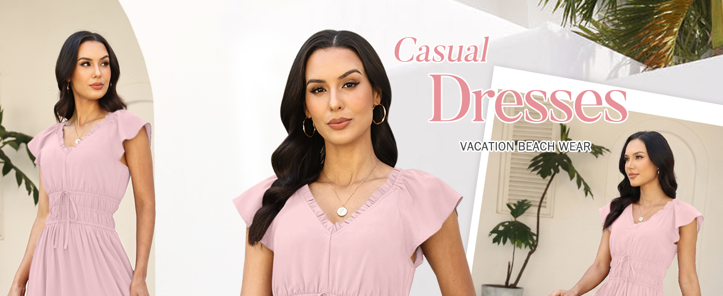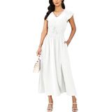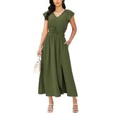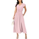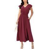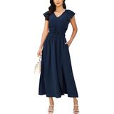 Design: featuring a modest front v-neck, two side pockets, frilled cap sleeves, elastic empire waist, decent slit length and low cut back, which flatters big bust, hide tummy and show off your curves. It's not only an event dress but also a throw & go summer dress.