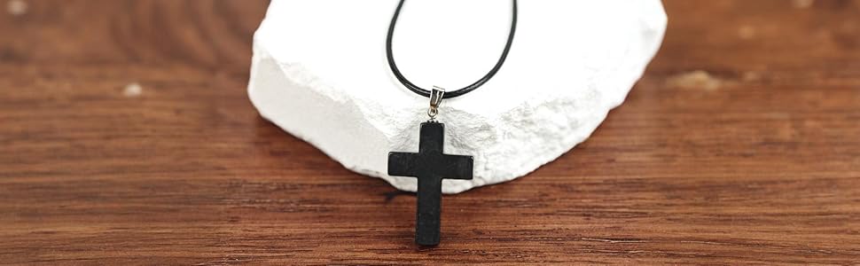 Shungite Crystal Cross Necklace - Black Healing Pendant with Leather Cord