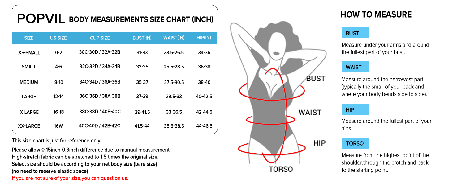 【Kind tips】All popvil bathing suits for women please refer to the popvil brand size. Choose your size based on the detailed measurements provided. Contact us with any questions. lf between sizes, size up for comfort.