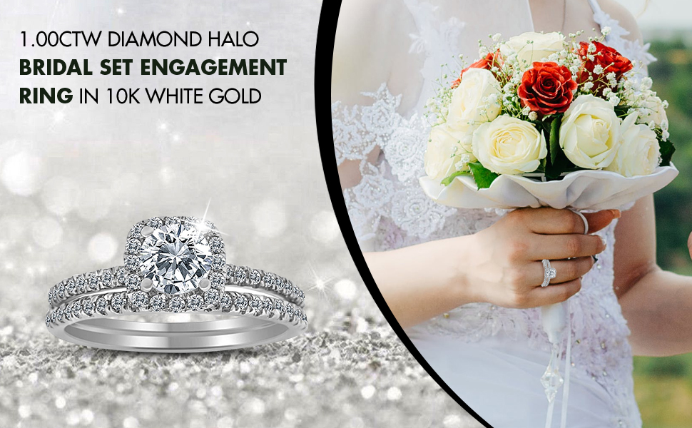 - Diamond bridal set is made with 10k white gold