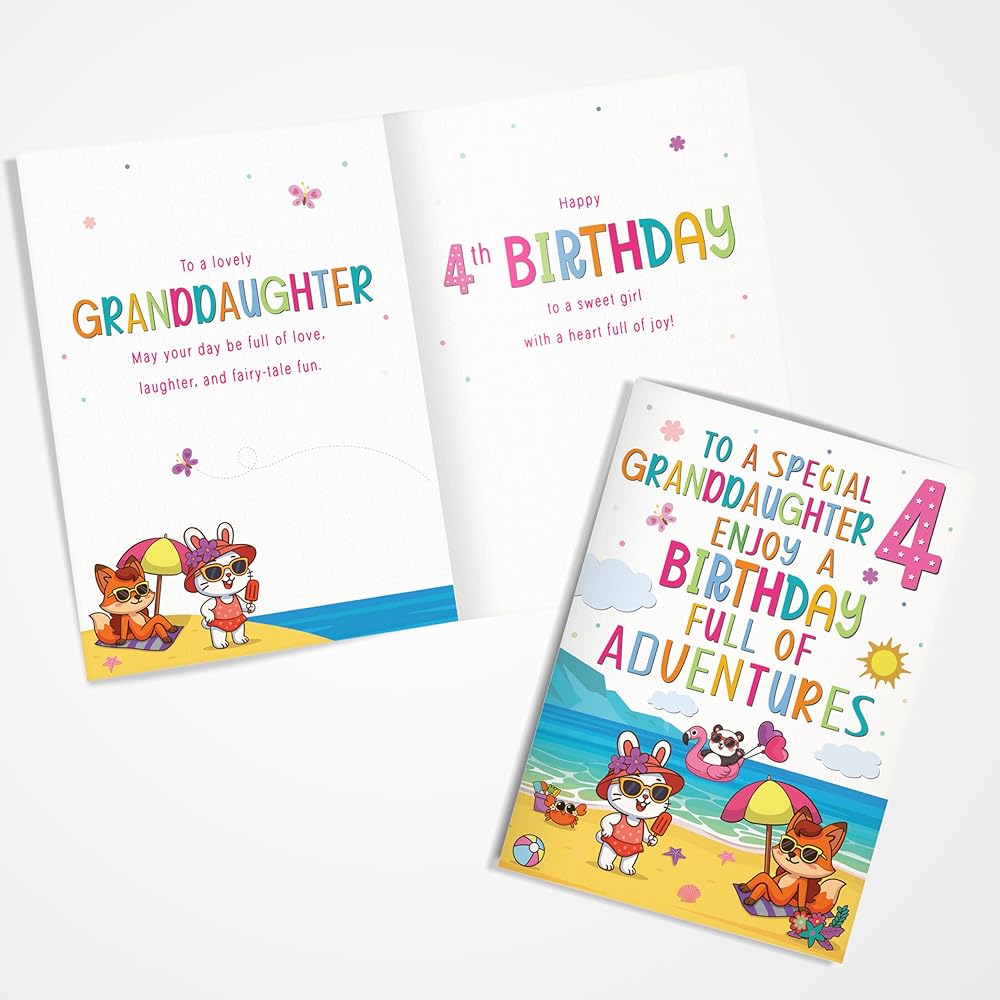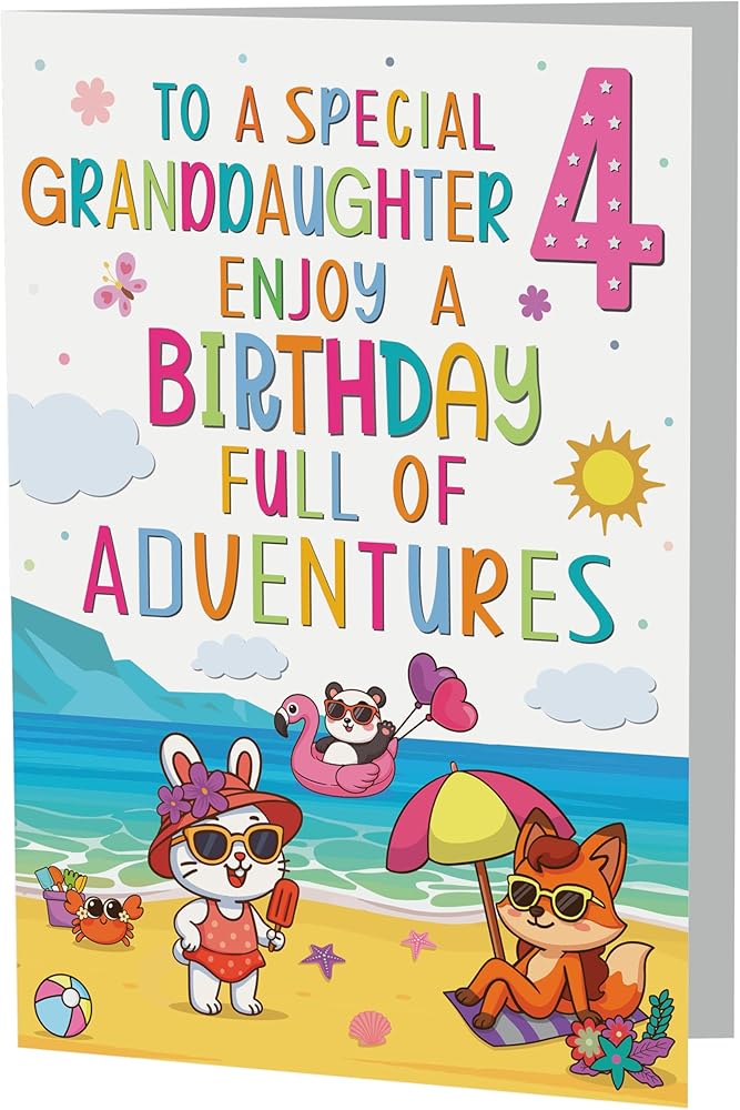 Cards Granddaughter 4th Birthday Card – Beach & Adventure Animal Design – A5 size Premium Greeting Card UK
