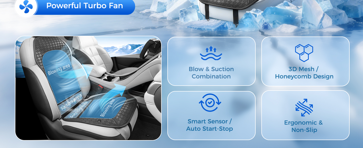 DUAL BLOW & SUCTION DESIGN + 8 POWERFUL TURBO FANS: Blows air on your back and sucks heat from waist/hips to cool fast. 8 quiet turbo fans deliver strong airflow, perfect for long summer drives.