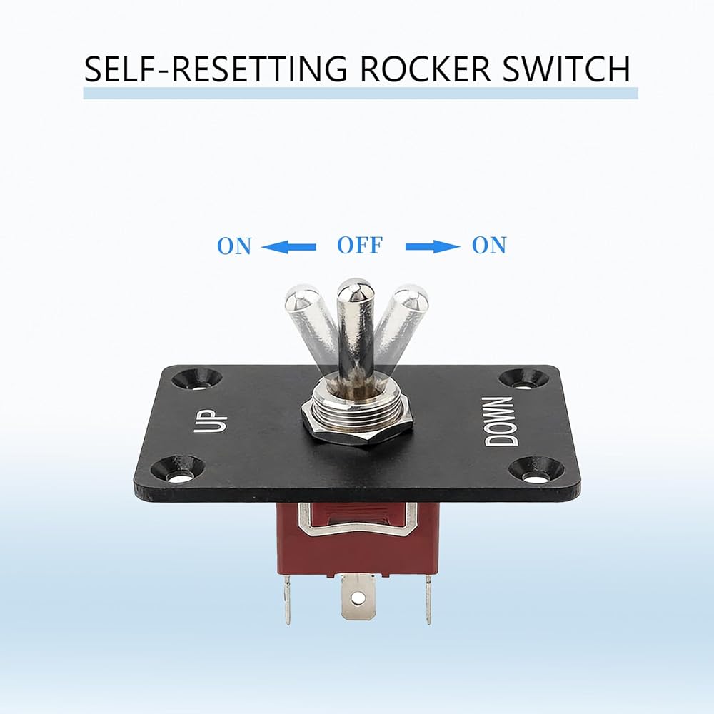 (ON)-Off-(ON) three-position design. Pushing the toggle to the “UP” or ‘DOWN' position momentarily energizes the circuit; releasing it automatically snaps the toggle back to the central “OFF” position, de-energizing the circuit. This provides precise pulse control, ideal for operating winches, hoists, starting motors, or other equipment requiring brief, safe power supply.