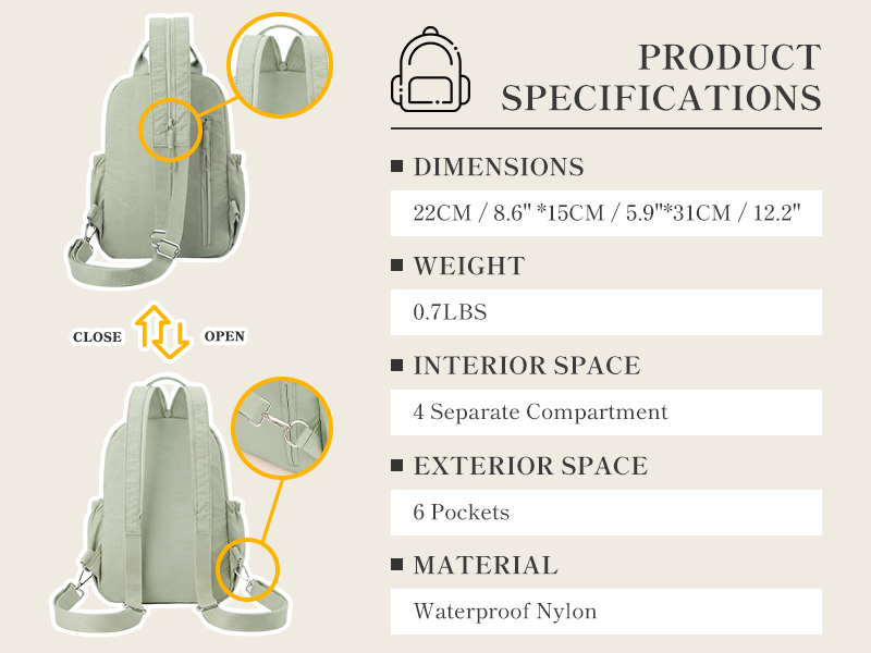 Lightweight & Compact: Dimension:12.2H*8.6L*5.9W inch,weight only 0.7lbs.This womens small backpack is designed for all-day comfort. Constructed from premium, wear-resistant, and water-repellent nylon, it confidently shields your belongings from light rain and splashes. Its chic, compact silhouette also serves as a stylish accent piece, adding a touch of modern sophistication to any outfit for girls and women of all ages