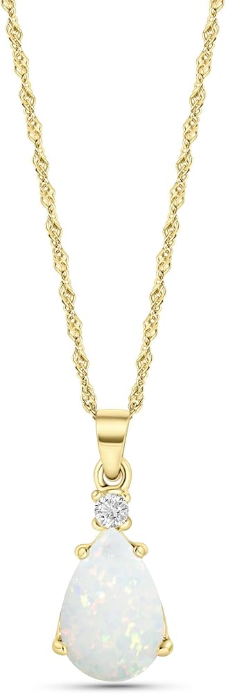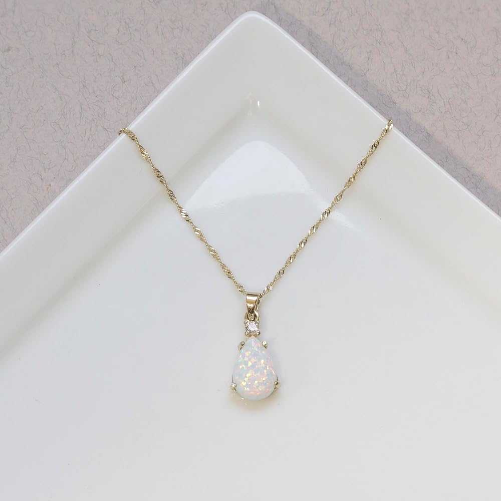 Simply Mesmerizing – Don a droplet of eye-catching beauty. Your white opal rich hue shimmers in the light while your yellow gold prongs and chain add touches of classic elegance.