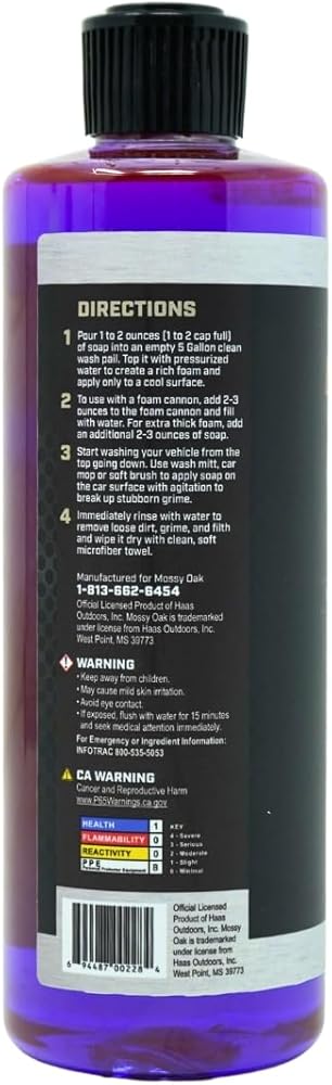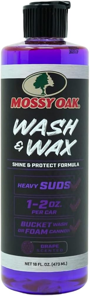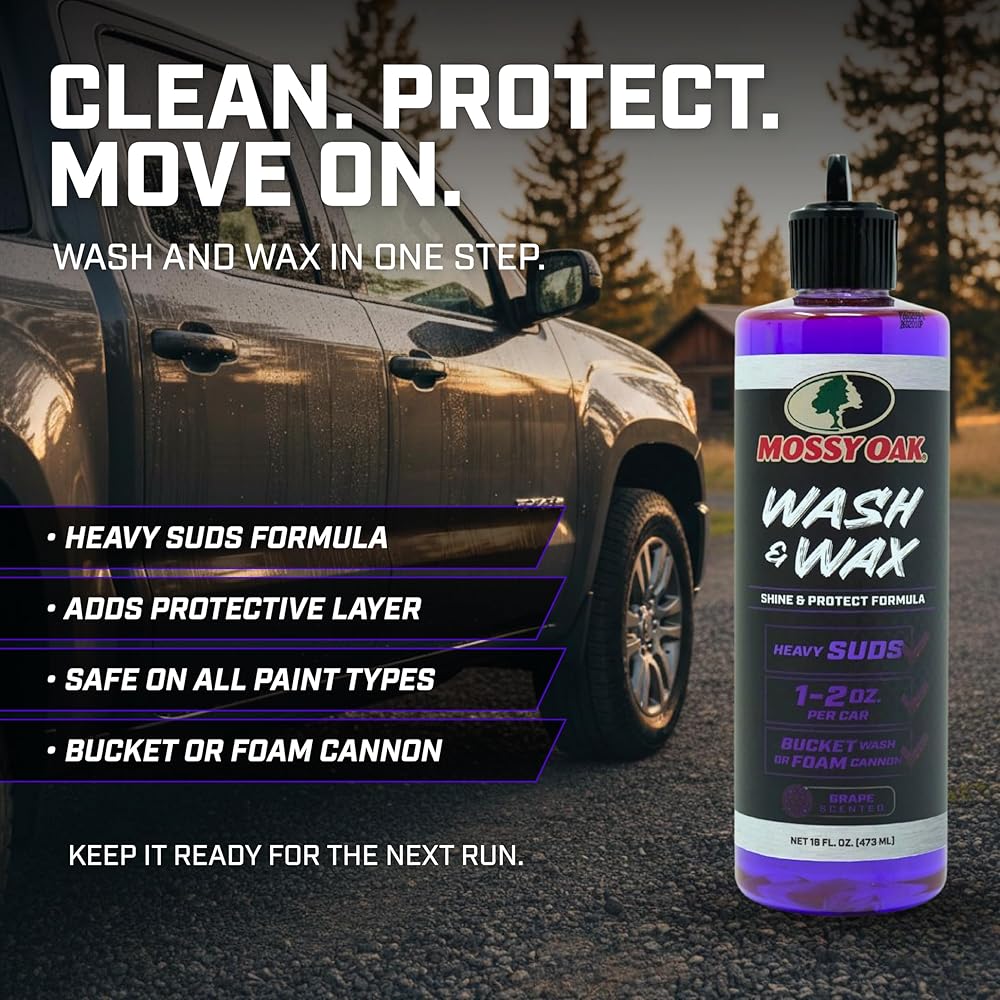 Why wash twice when you can do it once? Mossy Oak Wash & Wax is a concentrated foam soap with a built-in wax formula that removes dirt, grime, bugs, pollen, and road film while simultaneously laying down a slick, water-beading protective layer. The result is a deep gloss and hydrophobic finish that keeps your vehicle cleaner between washes and makes the next wash faster. Whether you drive a truck, SUV, sedan, Jeep, motorcycle, or UTV, this formula works across all of them. It is ideal for vehicles that spend time outdoors—parked on the jobsite, at the trailhead, or in the driveway between weekend trips. The pH-balanced, non-corrosive formula is safe on all exterior surfaces including paint, clear coat, chrome, aluminum, plastics, and rubber. Works seamlessly with foam cannons, foam guns, or a wash bucket and mitt. Mossy Oak has been the voice of the outdoors for over four decades. Wash & Wax carries that heritage forward—a product that respects your time, protects your investment, and performs in the real world. Biodegradable. Concentrated. Made in the USA.