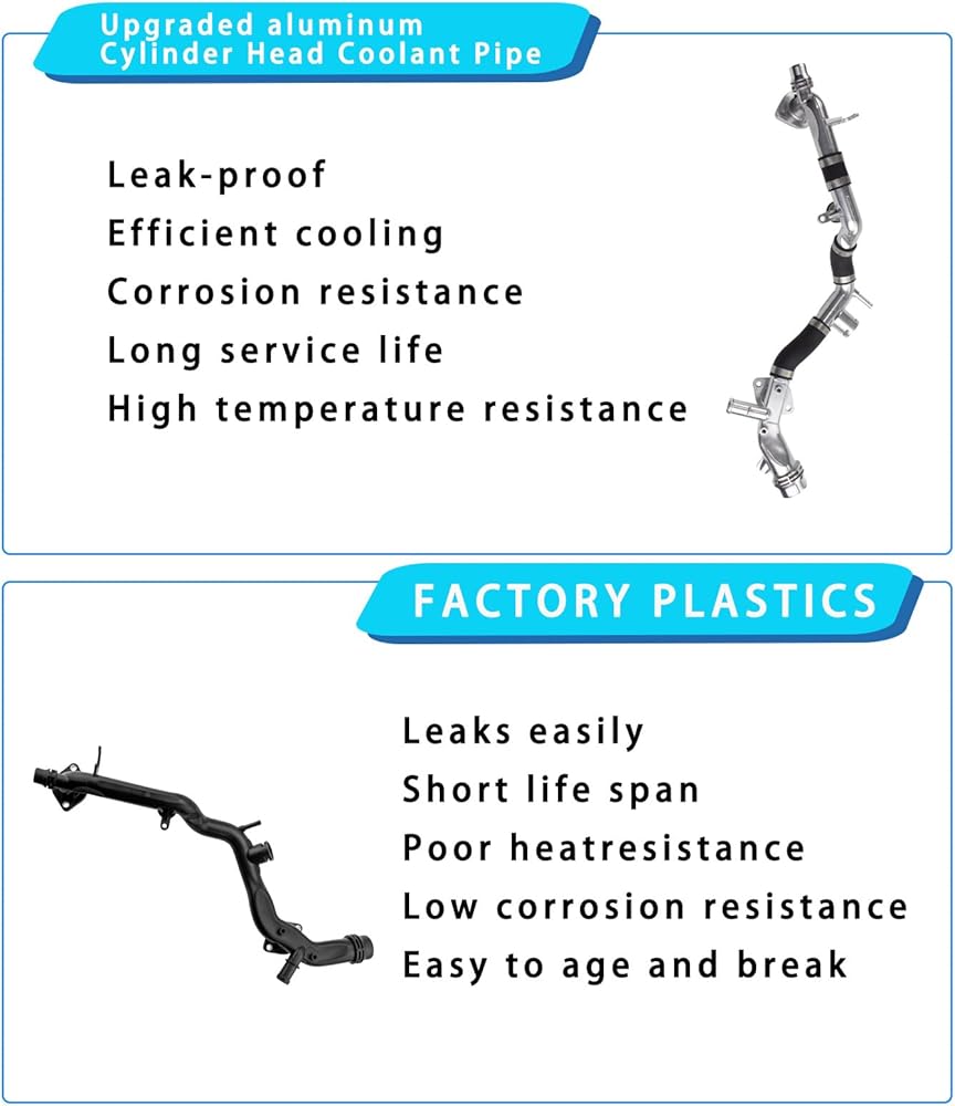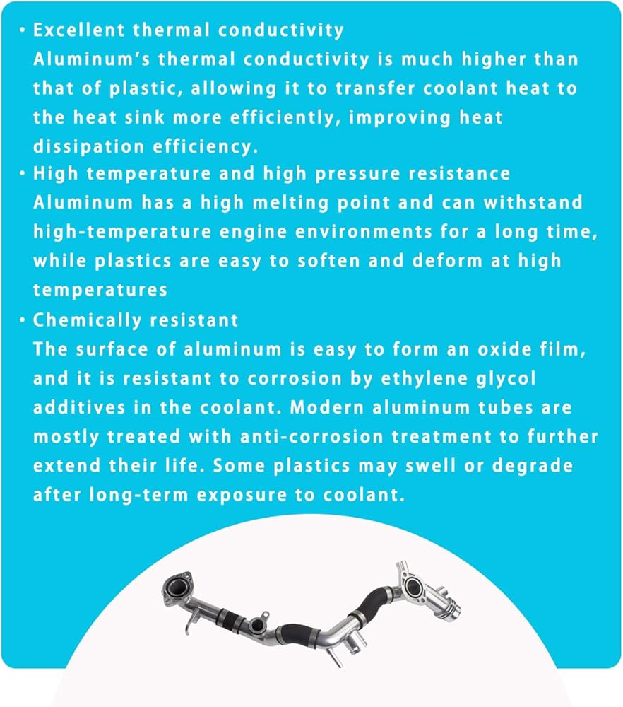 【PERFECT FIT】: The upgraded aluminum engine coolant radiator water pipe is made of aluminum alloy, which is resistant to high temperature and high pressure, chemical corrosion, high cooling efficiency, sealed and leak-proof, and keeps the engine running smoothly! It matches perfectly with the listed car models and is of better quality. It doesn't wear out as easily as the original plastic and fits perfectly like the original.