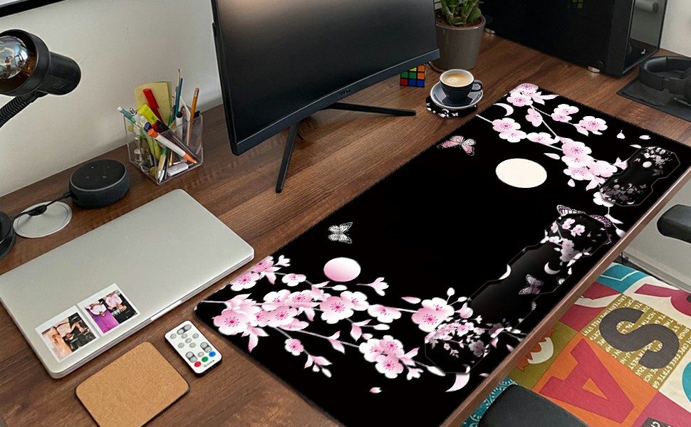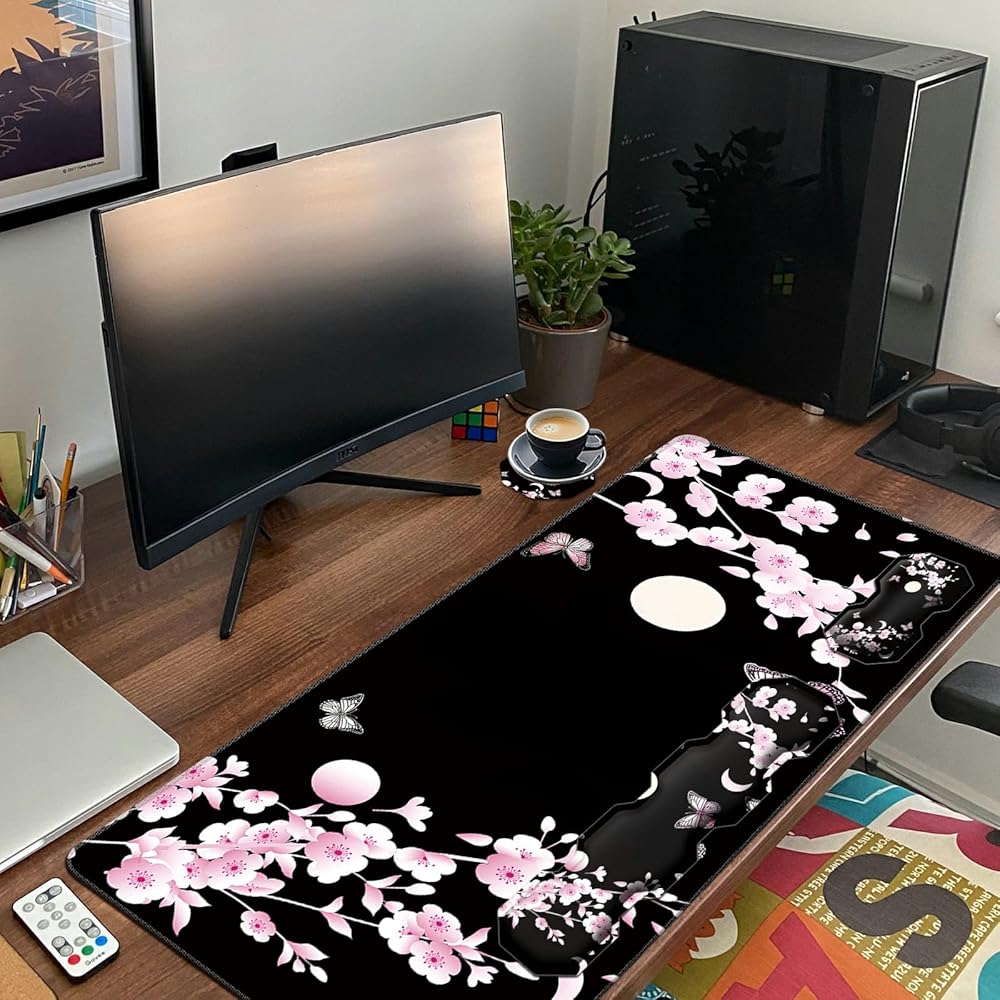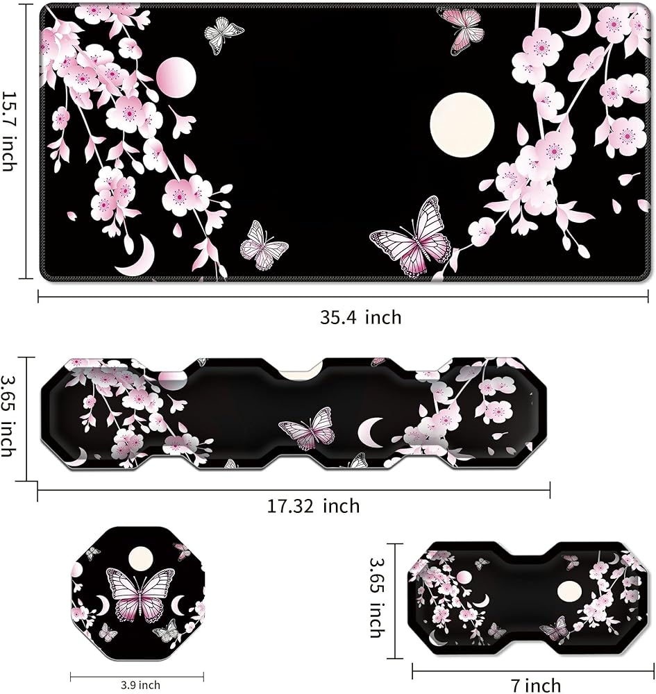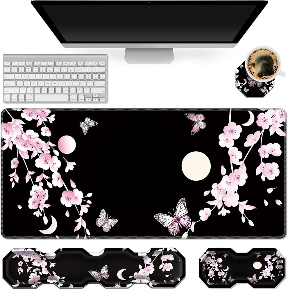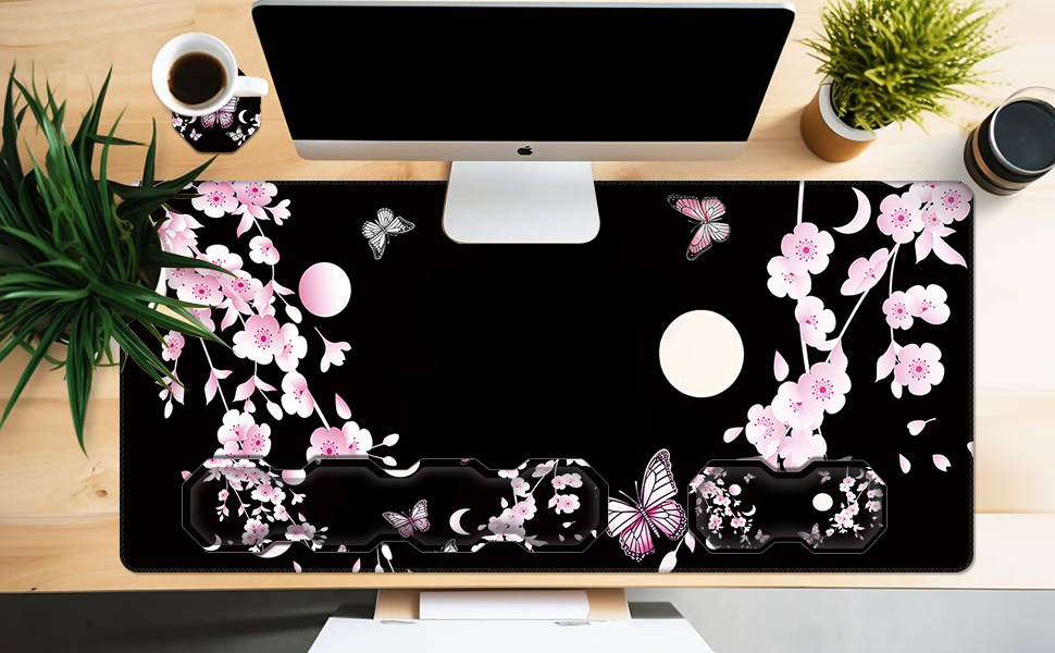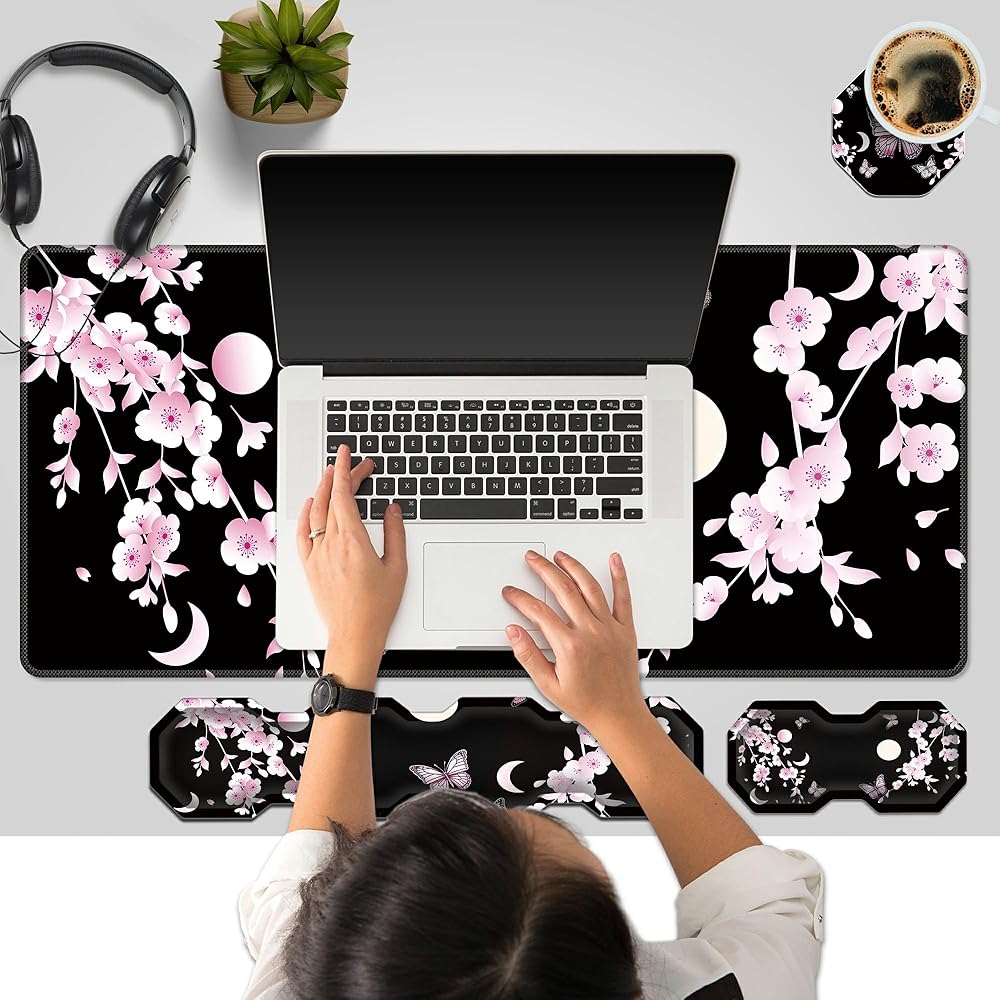 RYUITHDJP Large Mouse Pad for Gaming+Keyboard Wrist Rest+Wrist Support+Coaster Set of 4, XXL Extended Gaming Mouse Pad Desk Pad Easy Typing Pain Relief Non Skid Base Desk Mat-Cherry Blossom
