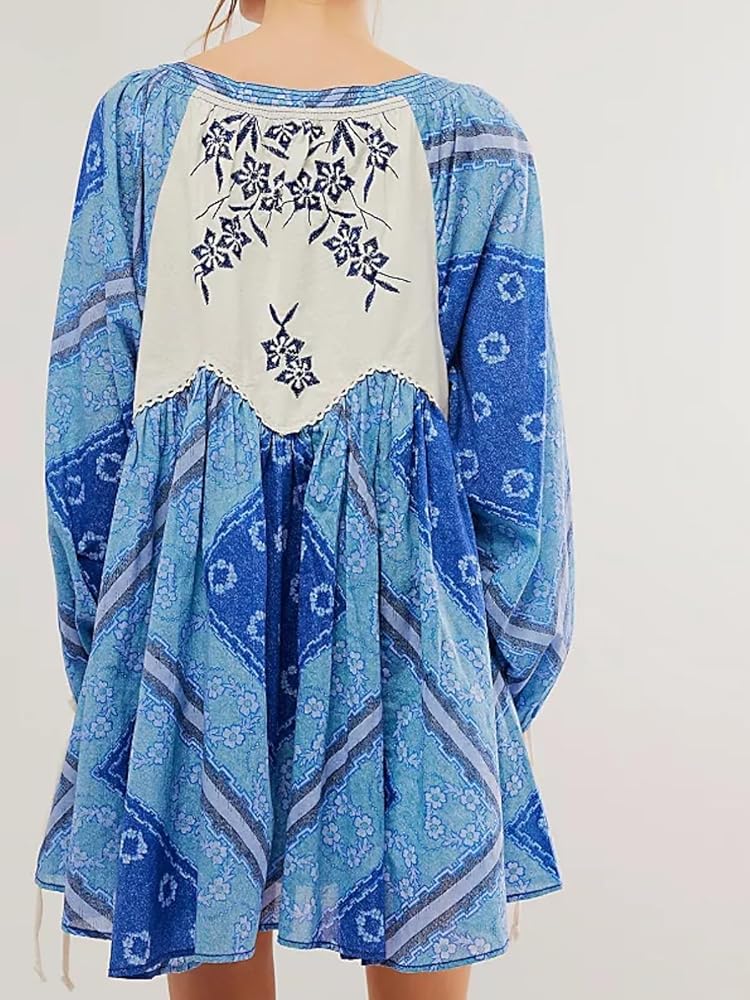 Unique Design:This women's bohemian mini dresses features a flowing silhouette, deep V-neck and patchwork style details, lace up details at the hem, contrasting embroidery details, and pleated details to add a three-dimensional feel.
