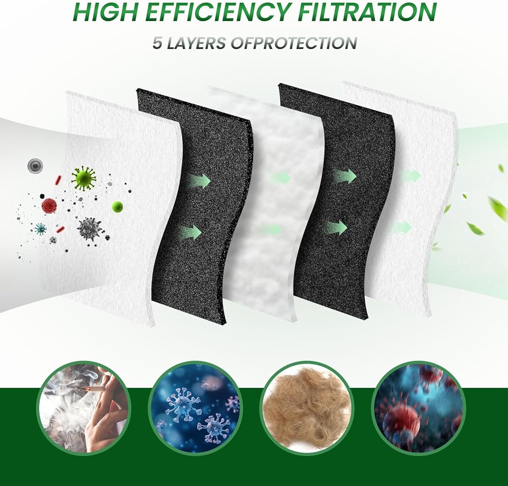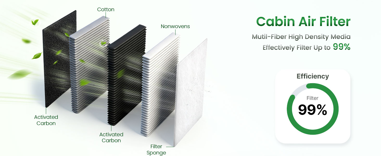 Efficient Airflow Filtration: Our cabin engine air filters are engineered with high-density breathable fabric material and advanced air filter layer technology, which not only effectively absorbs harmful gases and unpleasant odors, but also isolates more than 99% of dust particles, providing comprehensive protection and enjoying fresh breathing