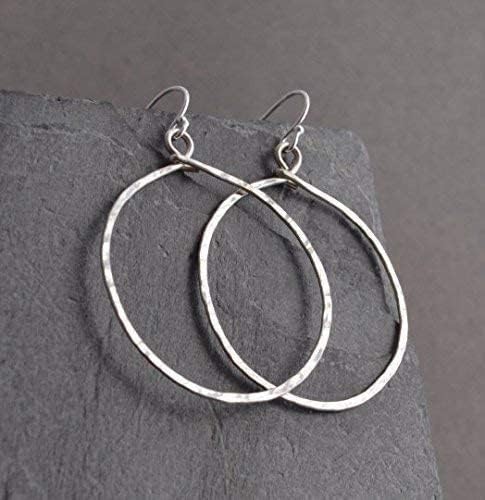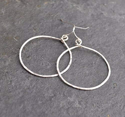 Basic everyday earrings, but with a little something extra. These earrings are hand formed and hammered, and hang from simple ear wire hooks. Each hoop is approximately 1.25 inches in diameter, and the total hanging length is almost 2 inches. They are very lightweight and versatile. Thank you for visiting, and come back soon! Note the last picture shows the small, medium, and large hoop sizes. This listing is for the large hoops only. Note: these earrings are now made with thicker ear wires and ear wire stoppers to prevent earring escape!