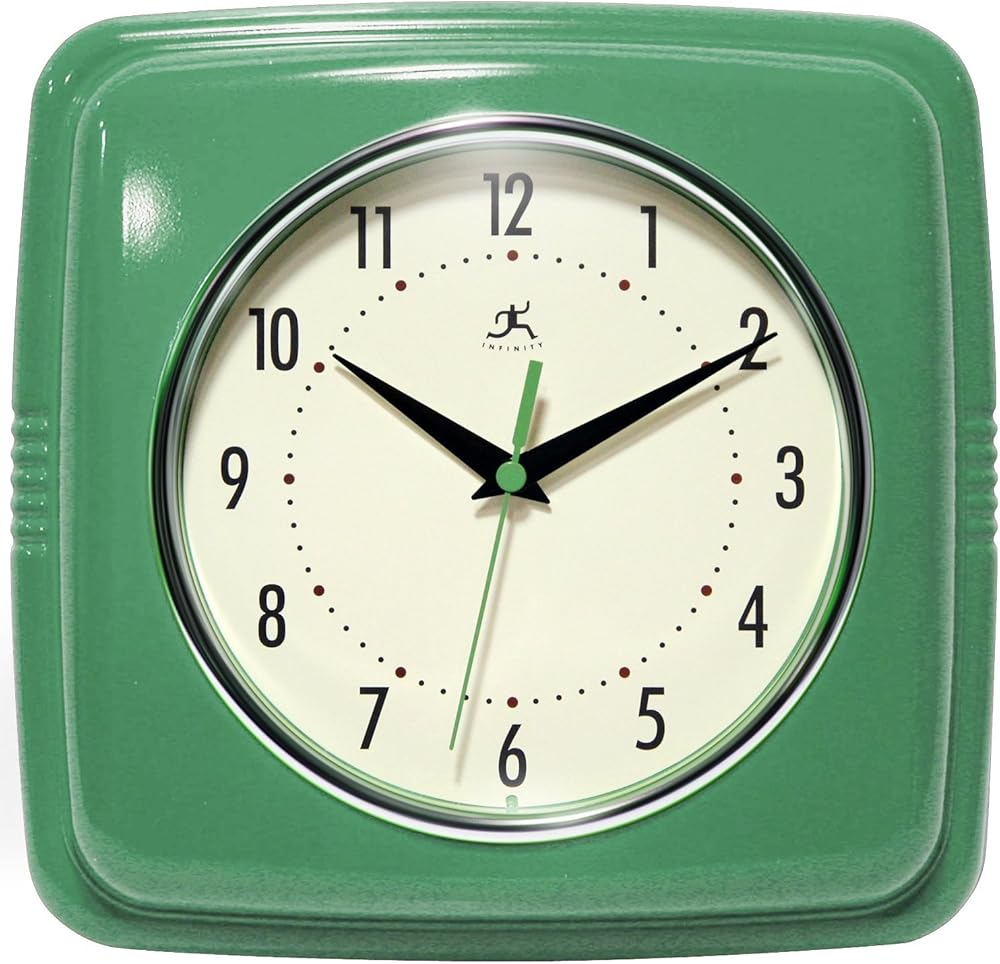 If you are looking to add a touch of yesteryear to your home, The Square Retro Green wall clock from Infinity Instruments will fit the bill. The unique wall clock features a sturdy metal frame in a rich green hue. This unique wall clock also features a glass cover, off-white face and black metal hands. With its silent and accurate quartz movement, this vintage clock will be a fixture in your home for years to come. Buy this vintage wall clock today and add retro cool to your home