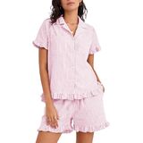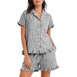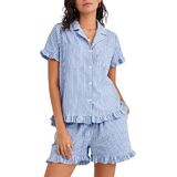 Tops: The striped lounge set for women features a short sleeve top with a flattering V-neck, lapel collar, button-down front, and charming ruffled cuffs. Two functional chest pockets add practicality
