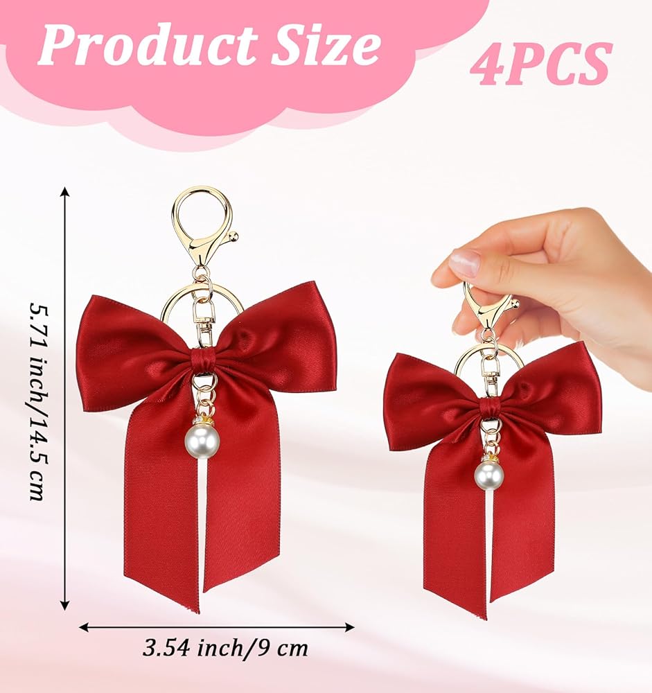 Bow Purse Charm Set: This 4-pack bag charms bow includes black, red, white, and green designs; The bowknot keychains add a cute touch to handbags and car keys;