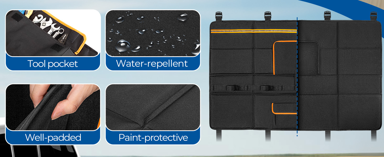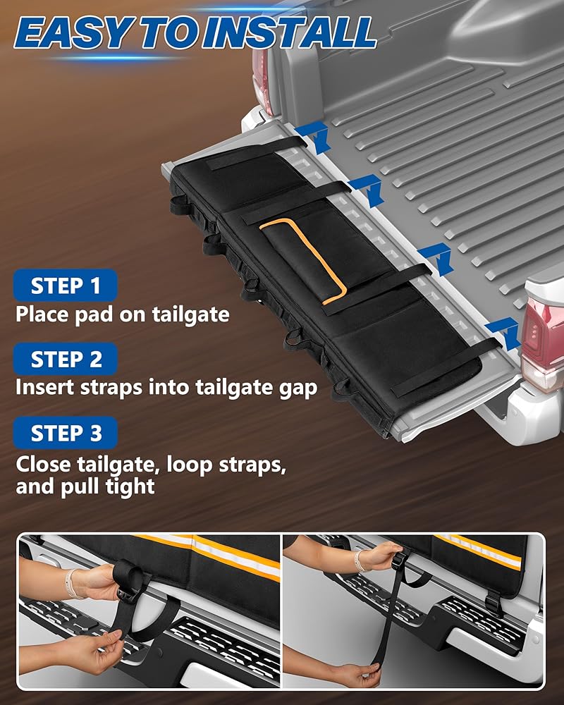 𝐄𝐀𝐒𝐘 𝐓𝐎 𝐈𝐍𝐒𝐓𝐀𝐋𝐋: Open the tailgate, place the pad on the tailgate, feed the straps from the back to front and connect.