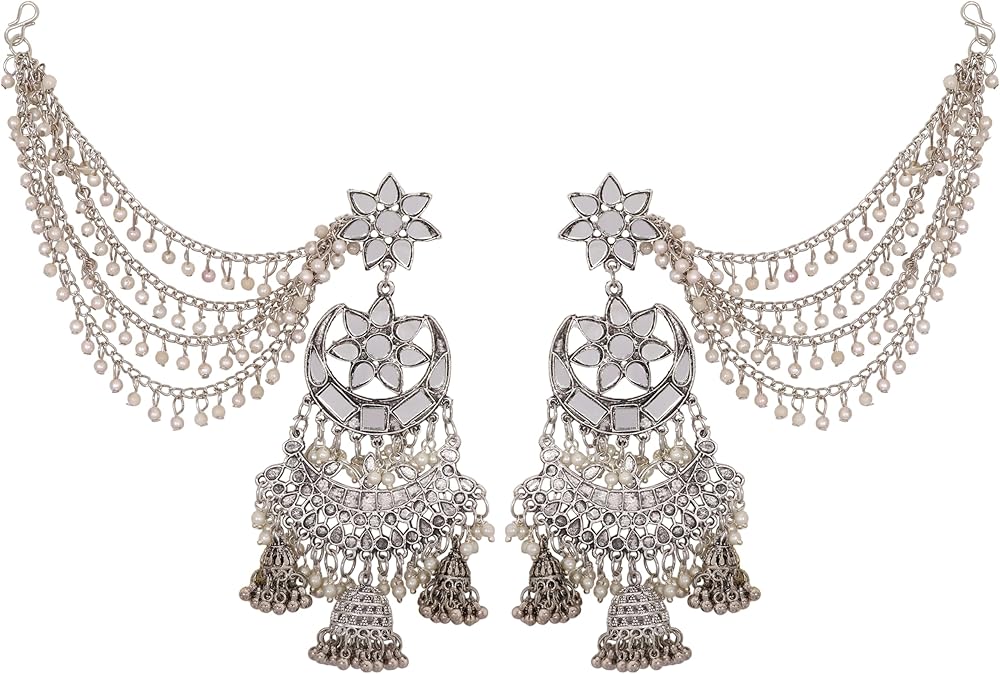 Ethnic Traditional Party-wear Silver Oxidized Pearl Mirror Indian Bahubali Jhumka Dangle Earrings Jewelry