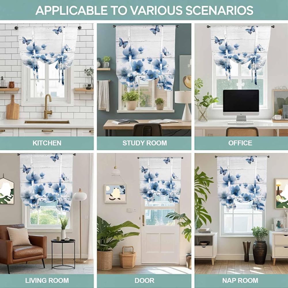 Navy Blue Floral Tie Up Curtains for Window, Spring Flowers Butterflies Wooden Thermal Insulated Balloon Shade Adjustable Rod Pocket Curtains Valance Panels for Kitchen Bathroom Café 42'' x 63''