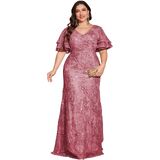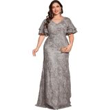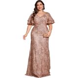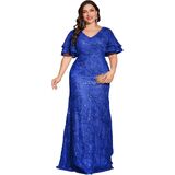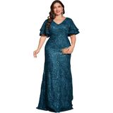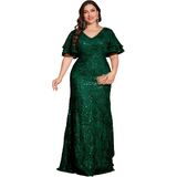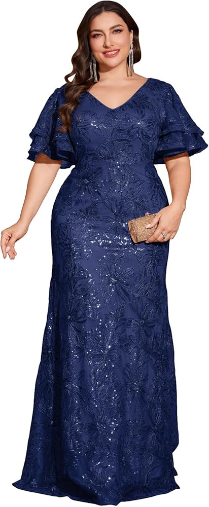 Make a stunning entrance in this exquisite navy blue evening gown designed for plus size elegance. The dress features an alluring V-neckline and graceful flutter sleeves that add a romantic touch to its sophisticated silhouette. The entire gown sparkles with intricate sequin embellishments arranged in a mesmerizing pattern that catches and reflects light beautifully. The fitted mermaid silhouette gracefully hugs your curves before flowing into a dramatic sweep at the bottom, creating a timelessly elegant profile. Perfect for formal occasions, wedding celebrations, or black-tie events, this dress combines comfort with glamour. The short flutter sleeves provide just the right amount of coverage while maintaining a fresh, modern appeal. The high-quality construction ensures the gown drapes beautifully, while the sequin detailing adds texture and dimension throughout. Accessorize with statement jewelry and a clutch to complete your show-stopping ensemble. This dress proves that formal wear can be both comfortable and incredibly flattering for plus size figures.