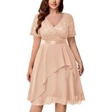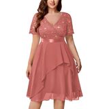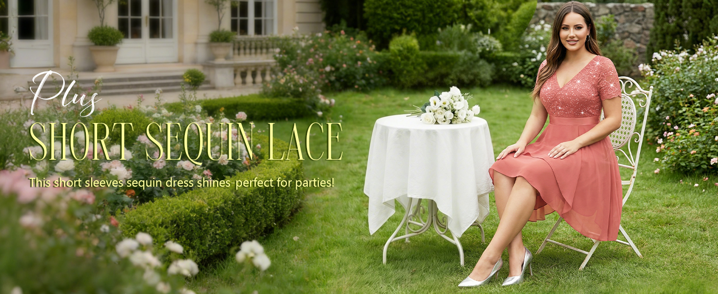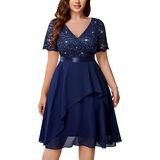 Features: Attractive Sequin Lace Top Design,Floral Lace Short Sleeves,Elegant Double V Design on Both the Front and the Back,Double Trim Tiered Chiffon Short Dress,Empire Waist,Zipper up Back,Knee Length,Slim Fitting