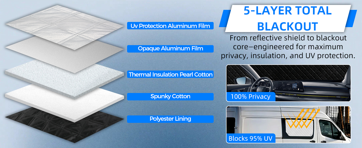 【Efficient Heat And UV Reflection】The aluminum-coated outer layer reflects solar radiation and blocks UV rays, helping maintain lower cabin temperatures. The durable materials withstand frequent use and exposure to various weather conditions while maintaining their protective properties.