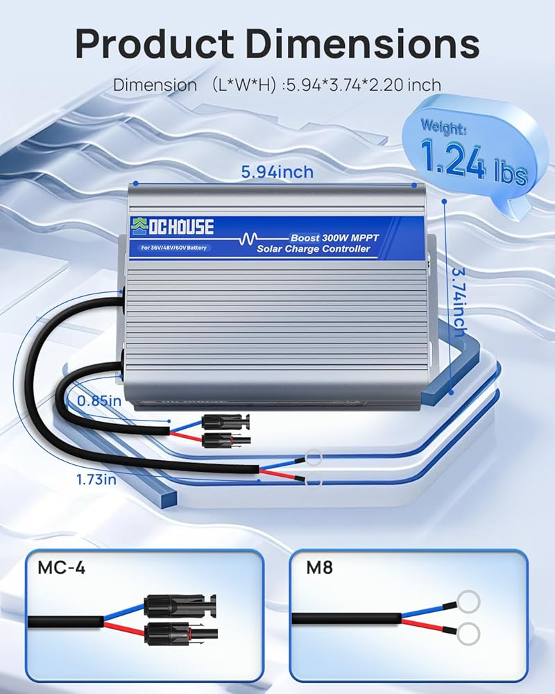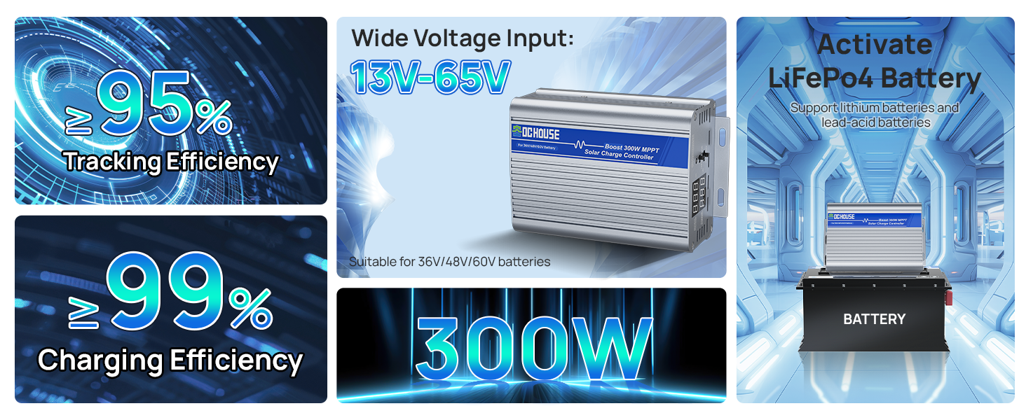 DC HOUSE 300W Boost MPPT Solar Charge Controller, 13V-65V Input, 99% Charging Efficiency, Suitable for 36V/48V/60V Lead-Acid/LiFePO4 Battery for Off-Gird/Home/Shed