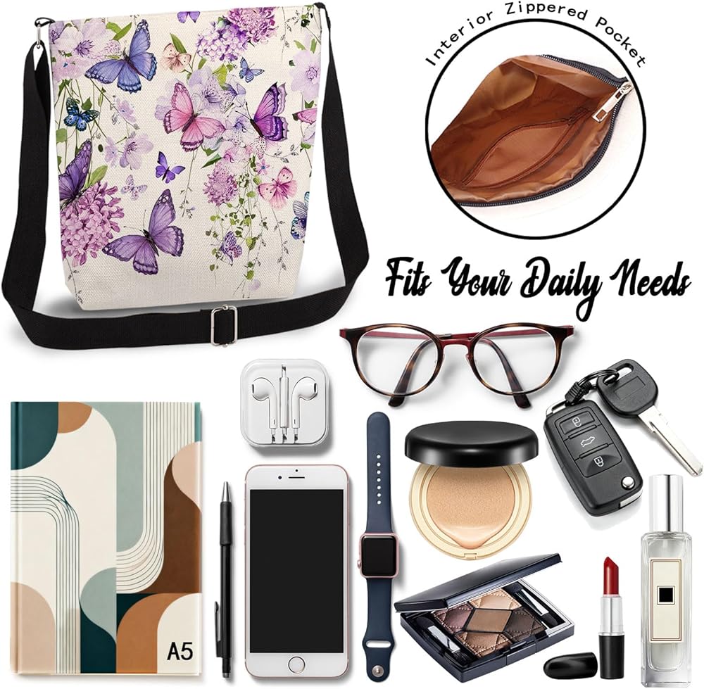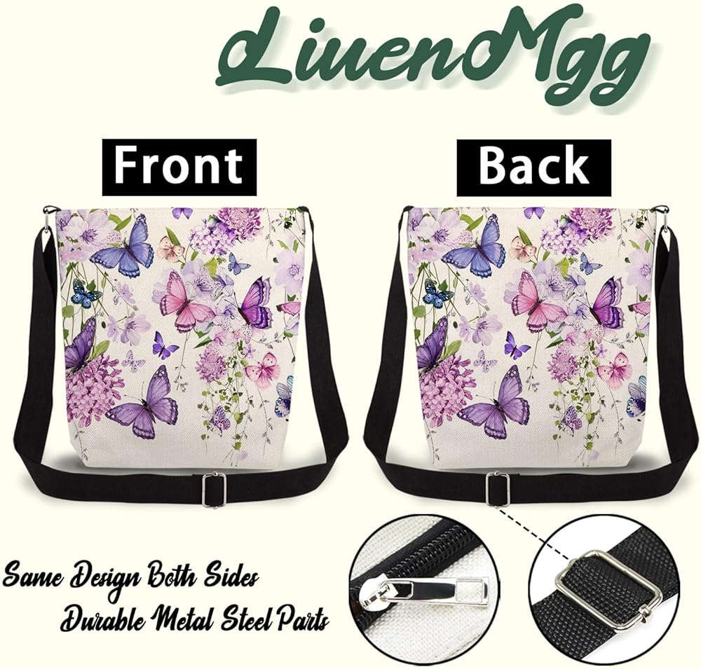 Your Everyday Essential Carrier! This LiuenMgg Purple Floral Butterfly print crossbody bag combines style and practicality with canvas-textured polyester and vivid double-sided prints. The top metal zipper offers quick access to a 23x22x6cm (9"x8.7"x3") main compartment (easily holds A5 items), while the internal zippered pocket keeps small belongings secure. Adjust the black woven strap (30-60cm/12"-24" drop) for personalized comfort. Featuring a structured bottom base for improved storage stability, this lightweight bag (73g/2.6oz) is ideal for daily use and makes a versatile gifting choice.