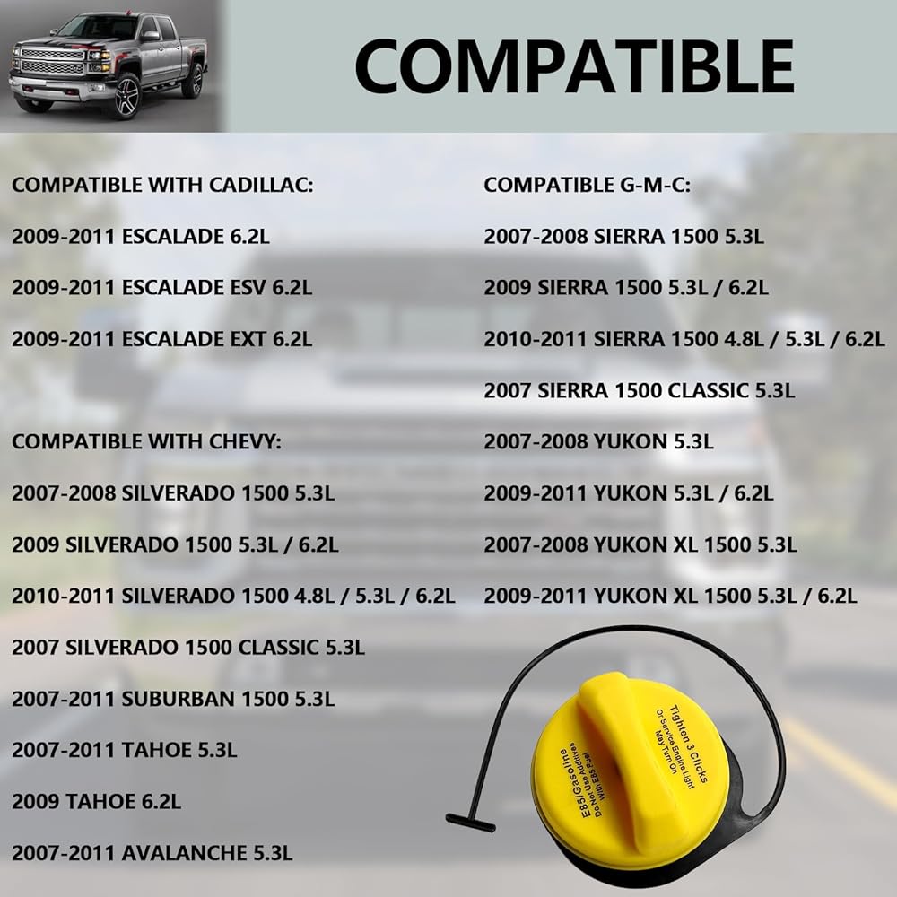 Compatible With Vehicles: The fuel cap is compatible with Chevy, Cadillac and GMC vehicles, compatible with Silverado 1500 2007-2011, Tahoe 2007-2011, Avalanche 2007-2011, Escalade(ESV EXT) 2009-2011, Sierra 1500 2007-2011, Yukon Yukon XL 2007 2011