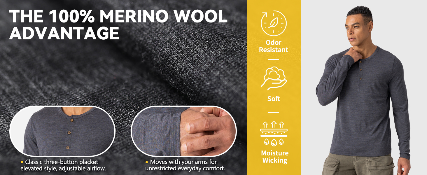 Stylish & Versatile: With its Henley design, this merino wool base layer mens is more stylish and versatile. Wear it alone or layer with sweaters or jackets. It's perfect for work, commuting, and outdoor activities.