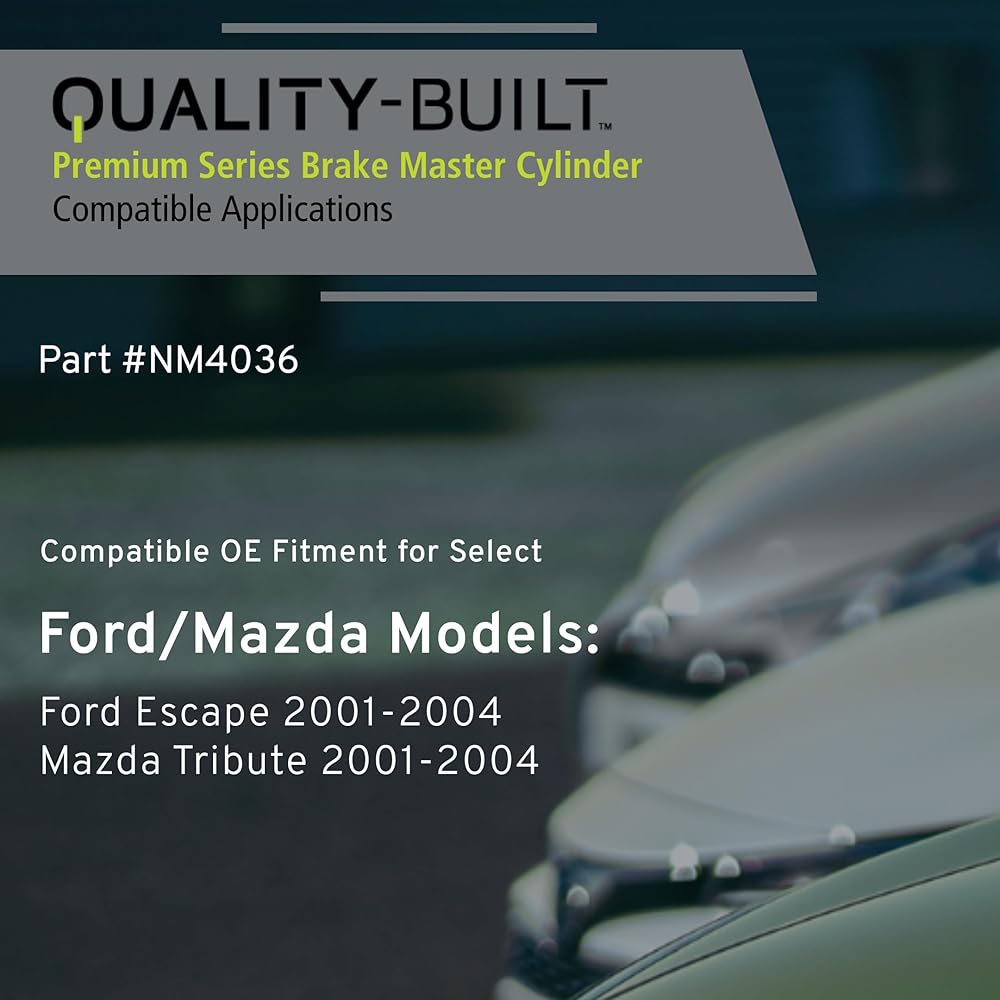 QUALITY-BUILT Premium brake master cylinders are engineered to restore factory brake responsiveness and deliver consistent hydraulic pressure-whether you're navigating city streets or cruising the highway. Ideal for vehicles needing a dependable OE-style replacement, they offer a direct-fit solution to maintain braking integrity. Each unit is manufactured to precise OEM standards using high-quality castings and seals for reliable fluid control, leak resistance, and extended service life. The result? Confident pedal feel, accurate pressure modulation, and smooth, predictable stops in every condition. QUALITY-BUILT Premium master cylinders undergo 100% pressure testing and include factory-style reservoirs where applicable, ensuring proper fluid capacity and fitment right out of the box. Internal components are engineered for durability and consistent output-mile after mile. Designed for easy installation and long-term reliability, QUALITY-BUILT Premium master cylinders are trusted by DIYers and professionals alike. Pair them with QUALITY-BUILT brake components for a complete brake system refresh-built for durability, engineered for peace of mind.PART SPECS: DESC: QUALITY-BUILT Premium Brake Master Cylinder with Reservoir NM4036 - Compatible with 2001-2004 Ford/Mazda (Escape,Tribute) Master Cylinder Bore Diameter inches: 1