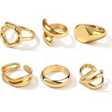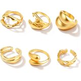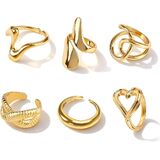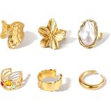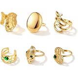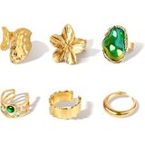 Luxurious 6-Piece Artistry: A bold collection of chunky gold rings featuring eclectic designs-from an irregular baroque-inspired green gemstone centerpiece and golden floral blooms to textured organic shapes-perfect for mixing into eye-catching stacks or wearing individually as statement pieces.