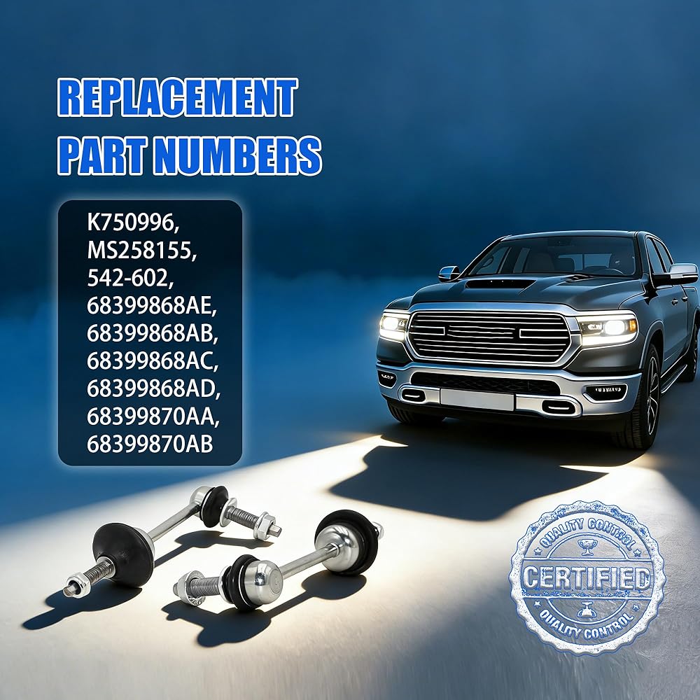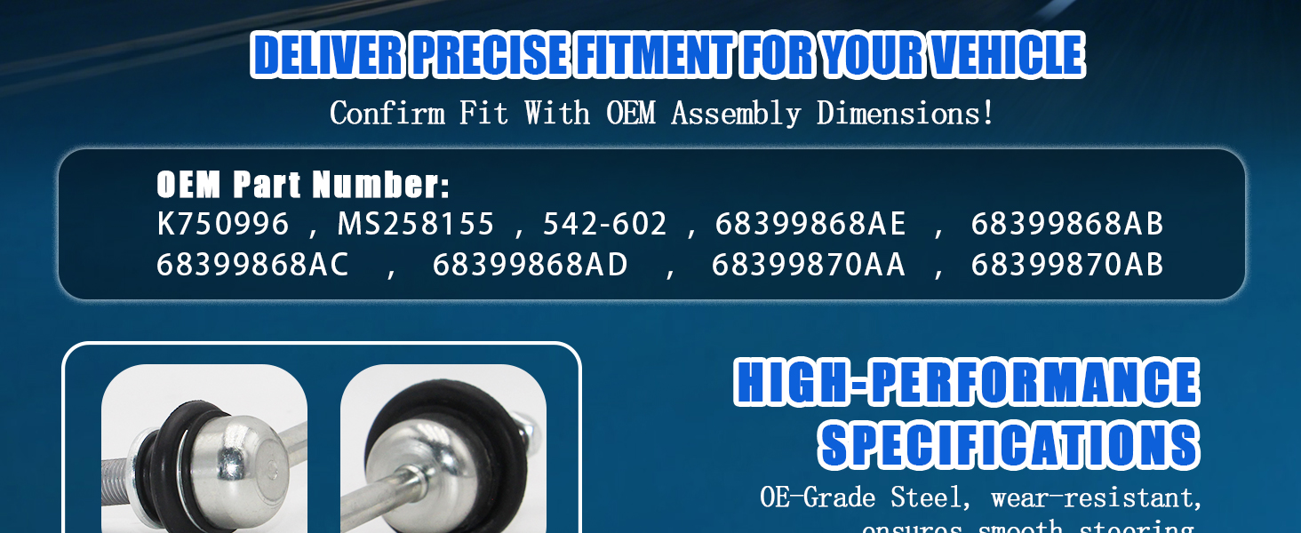 ✨【Direct OEM Replacement & Easy Installation】Exact replacement for OE part numbers K750996 MS258155 542-602 542602 68399868AE 68399868AB 68399868AC 68399868AD 68399870AA 68399870A. This kit comes with 2 front stabilizer bar links (driver & passenger side), installable by removing old bolts and connecting to sway bar/control arm—no complex tools required.