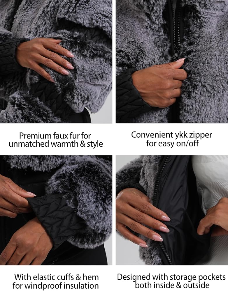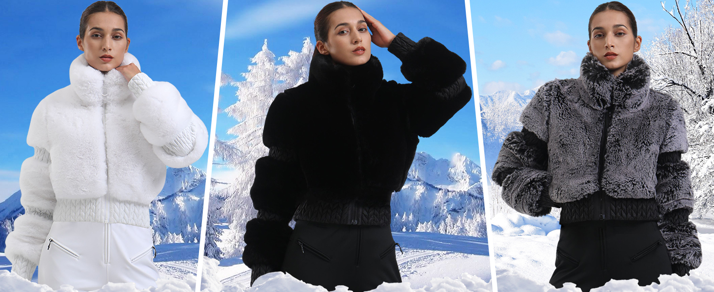 This faux fur women ski jackets is a winter essential. Made from high-quality materials including 100% polyester fabric, 100% nylon fabric and lining, and 100% polyester padding for insulation. It has a regular fit for comfort and ease of movement.