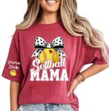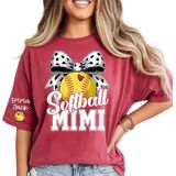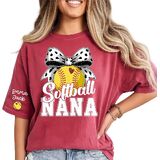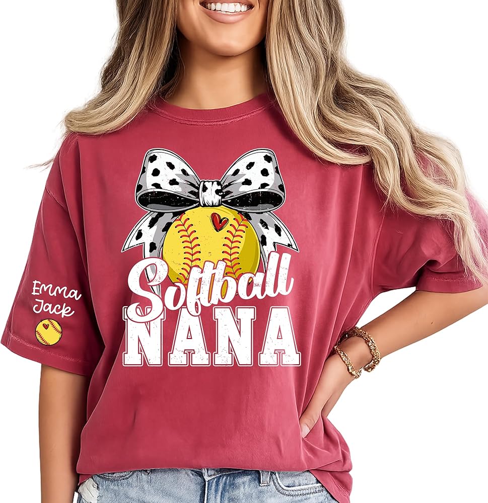 Celebrate your love for softball and family with this fun, personalized Softball [Nickname] T-shirt. The shirt showcases bold "Softball [Nickname]" text with a playful softball and bow graphic, perfect for any proud [Nickname] at every game. The design features a vibrant, eye-catching softball with a heart-shaped stitch detail and a playful polka dot bow, making it not only a celebration of softball but also a nod to family pride. Customize the shirt by adding your choice of nickname (e.g., Mama, Nana, Mimi) and your kids' or grandkids' names on the sleeves, creating a truly unique and heartfelt design that will stand out wherever you go. Crafted from soft, breathable fabric, this t-shirt provides ultimate comfort during family gatherings, game days, or casual outings. Whether you're cheering from the sidelines or enjoying time with family, you'll look and feel great. The high-quality print ensures that your custom design stays vibrant even after multiple washes, maintaining its bold colors and crisp details. This personalized Softball [Nickname] shirt is the perfect gift for any proud [Nickname] who loves softball and family. It's a thoughtful gift for Mother's Day, birthdays, or any occasion where you want to show appreciation for your softball-loving [Nickname]. Let your [Nickname] proudly display their support for their grandkids or kids with this charming, custom t-shirt.