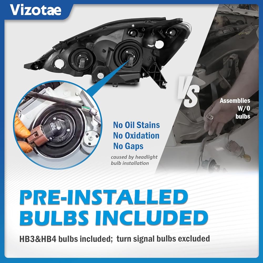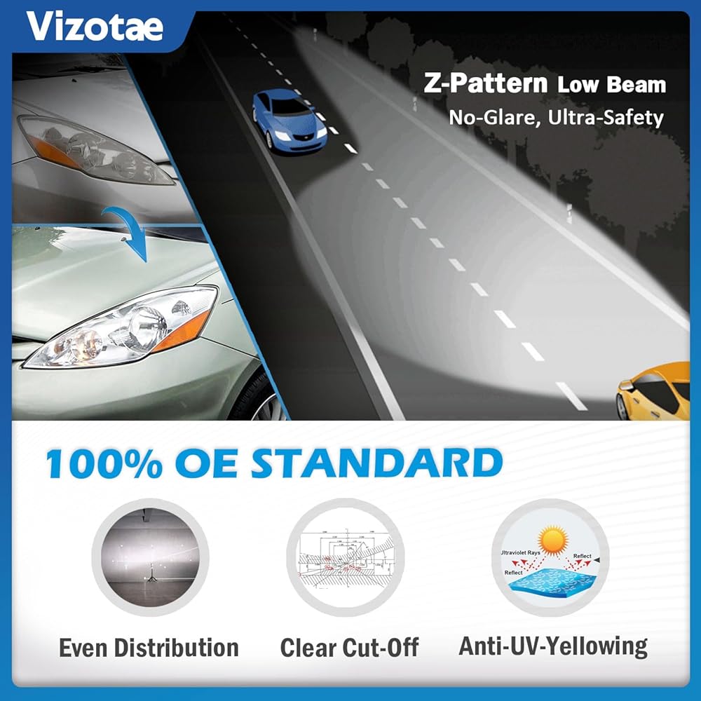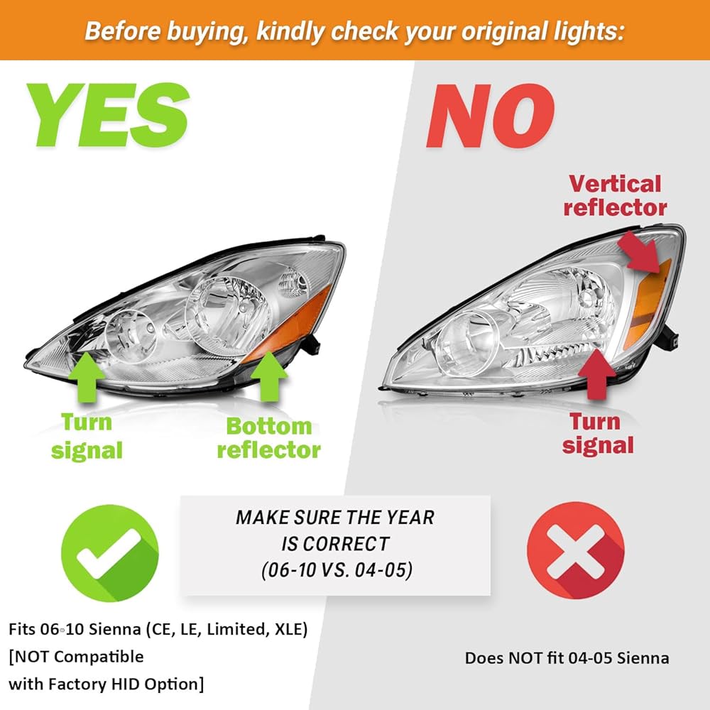 **OEM-Quality Assurance**: 𝐎𝐄𝐌# 81150AE030, 81110AE030 𝐏𝐚𝐫𝐭𝐬𝐥𝐢𝐧𝐤# TO2502172, TO2503172. Meticulously tested for 100% compatibility, precisely modeled to fit your original car model: Compatible with 2006-2010 Toyota Sienna Minivan (All Trims: CE, LE, XLE) & Cargo Van[𝗡𝗢𝗧 𝗖𝗼𝗺𝗽𝗮𝘁𝗶𝗯𝗹𝗲 𝘄𝗶𝘁𝗵 𝗙𝗮𝗰𝘁𝗼𝗿𝘆 𝗛𝗜𝗗 𝗢𝗽𝘁𝗶𝗼𝗻. Kindly note, Only include Low/High beam bulbs.