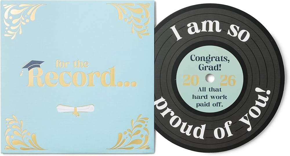 Celebrate the monumental achievement of graduation with our unique Graduation Card – Vinyl Record Style Retro Music-Themed Congratulations Card. This card is the perfect way to honor the hard work and dedication of high school, college, and university graduates. Designed with a nostalgic vinyl record theme, it captures the essence of a bygone era while delivering a modern message of congratulations. Whether youre searching for graduation gifts for her or him, this card is a standout choice that pairs beautifully with any graduation gift, making it a memorable keepsake for years to come. Our graduation card is more than just a piece of paper; its a heartfelt congratulations gift that resonates with music lovers and retro enthusiasts alike. The vibrant design and high-quality materials ensure that this card will be cherished long after the graduation ceremony is over. Its an ideal choice for a wide range of graduates, including those completing their masters degree, nursing school, police academy, or even a PhD. With its universal appeal, this card is perfect for college graduation gifts for women and men, as well as high school graduation gifts for boys and girls. Its a versatile option that fits seamlessly into any celebration, whether youre looking for a funny graduation card or a more traditional congratulations card. Make your graduate feel truly special with a card that speaks to their unique journey. Our Graduation Card 2026 is not just a card; its a proud of you gift that acknowledges their hard work and dedication. Its perfect for those seeking a grad card that stands out from the rest, offering a touch of nostalgia with its retro music theme. Whether youre celebrating a nurses graduation, a PA graduation, or any other milestone, this card is a thoughtful addition to any graduation gift. Show your support and admiration with a card that captures the spirit of achievement and the joy of new beginnings. Order now and make your graduates day unforgettable!