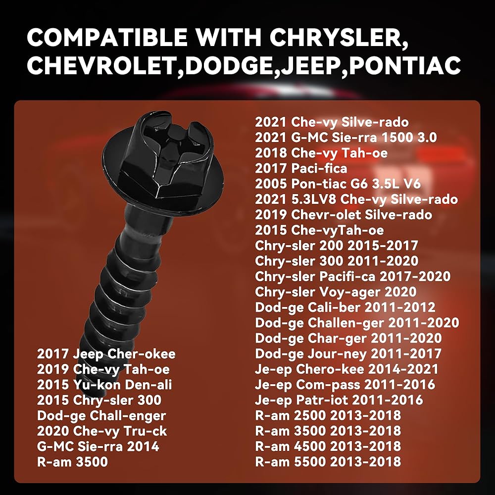 Scope of Use: This air filter housing retaining bolt fits 2017 Cherokee, 2019 2018 2015 Tahoe, 2015 Yukon Denali, 2015 Chrysler 300, Sierra 2014 model, 2021 Sierra 1500 3.0 model, 2017 Pacifica, 2005 Pontiac G6 3.5L V6, 2019 Silverado, Chrysler 200 2015-2017, Pacifica 2017-2020, Mariner 2020, Caliber 2011-2012, Journey 2011-2017, Cherokee 2014-2021, Compass 2011-2016, Patriot 2011-2016, 2500/3500/4500/5500 2013-2018.