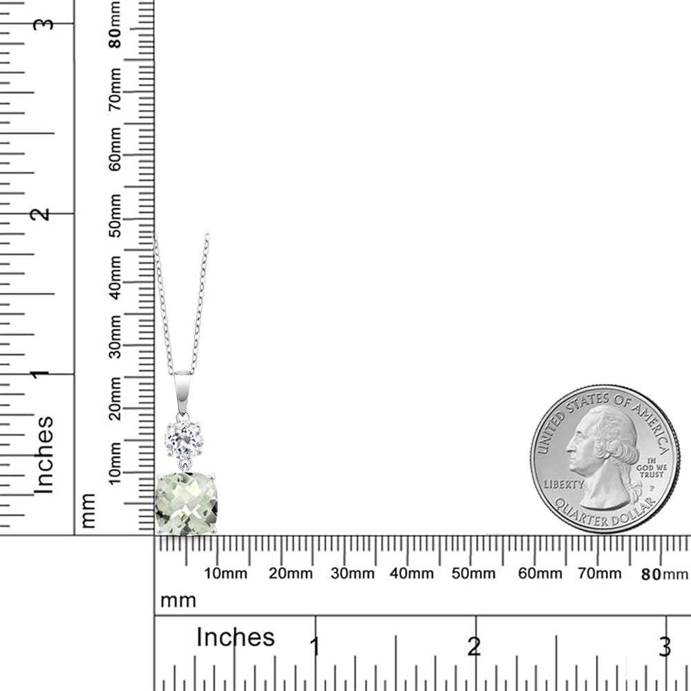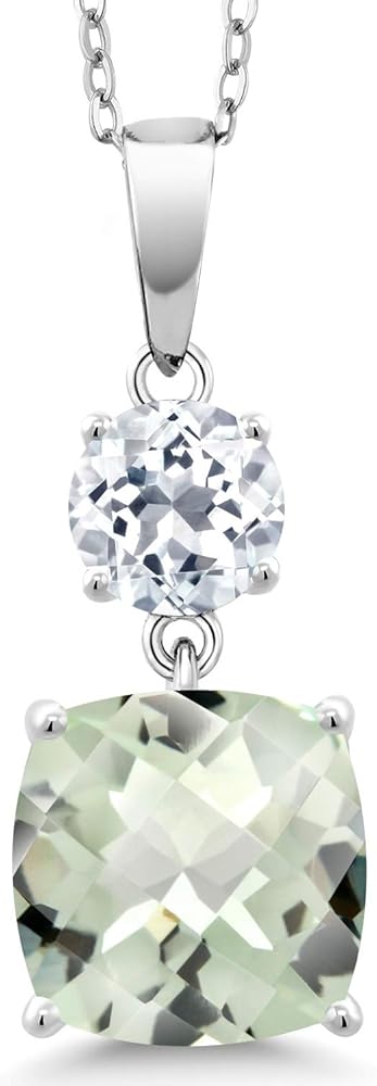 Gem Stone King 925 Sterling Silver Green Prasiolite and White Topaz Pendant Necklace For Women (4.65 Cttw, Gemstone Birthstone, Cushion Checkerboard 10MM, Round 6MM)