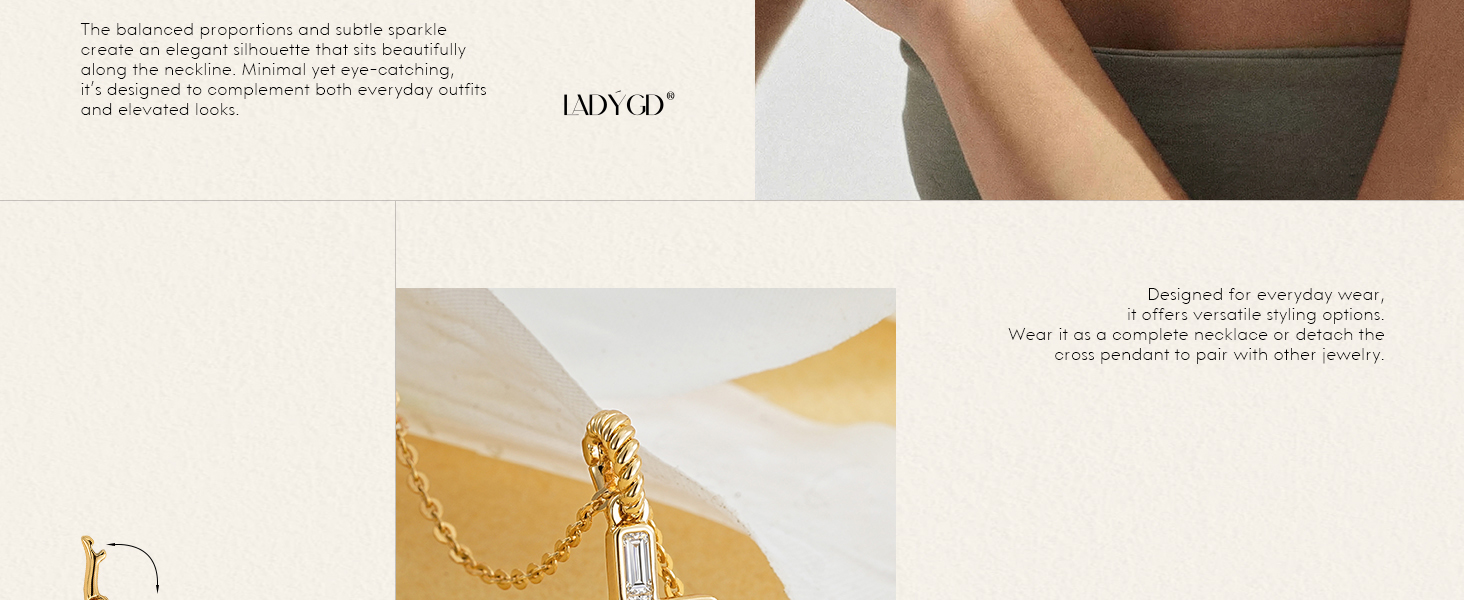 LADYGD Cross Necklace for Women combines a timeless cross design with a modern removable pendant detail. Designed with Cubic Zirconia and a refined gold plated finish, this piece offers a dainty look that feels meaningful, polished, and easy to style.