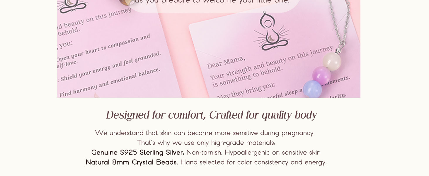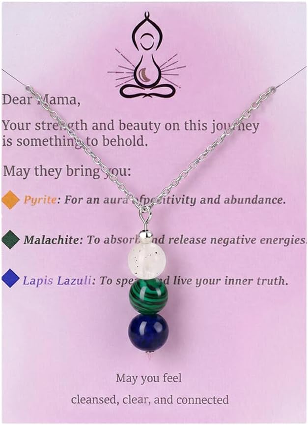 Crystal Necklace for Women: This silver necklace for women is a dainty necklace, featuring a crystal pendant necklace on a delicate chain necklace; This charm necklace showcases three natural stones: Amethyst for peaceful sleep, Blue Lace Agate for loving clarity, and Moonstone for enhanced intuition; Together, they channel gentle energy, offering inner peace and strength for expectant mothers; Discover this piece among our necklaces for women, women's necklaces, and silver necklaces