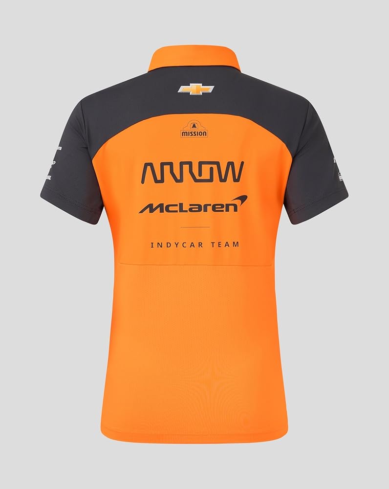 Elevate your style this season with the Official Women's Arrow McLaren IndyCar Team Polo Shirt. Expertly designed with a mesh back panel and reflective, laser-cut underarm holes, it ensures optimal airflow during intense moments on the track. A dropped hemline and pointed collar provide extra protection from harsh elements. Reflective taping on the shoulders enhances visibility in low light, while official team sponsors proudly display your team allegiance.