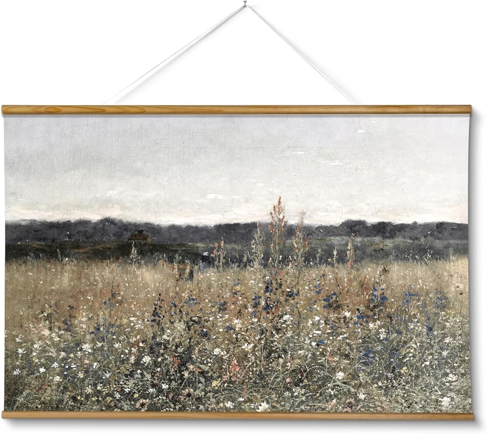 ARPEOTCY Extra Large Vintage Framed Wall Art, 36x54 Inch Flower Meadow Landscape Hanging Framed Wall Art Decor for Living Room Bedroom, Canvas Prints, Retro Scenery Pictures Above of Bed