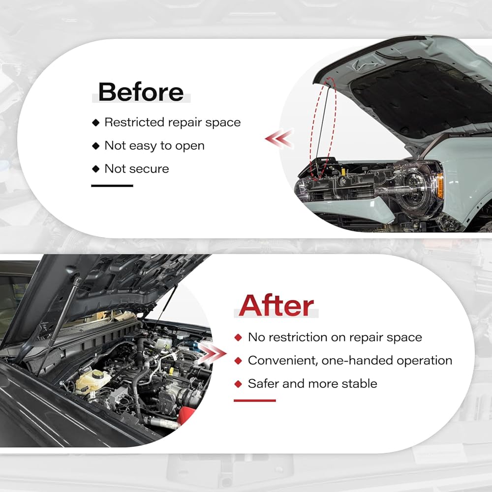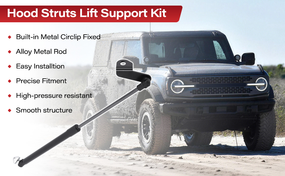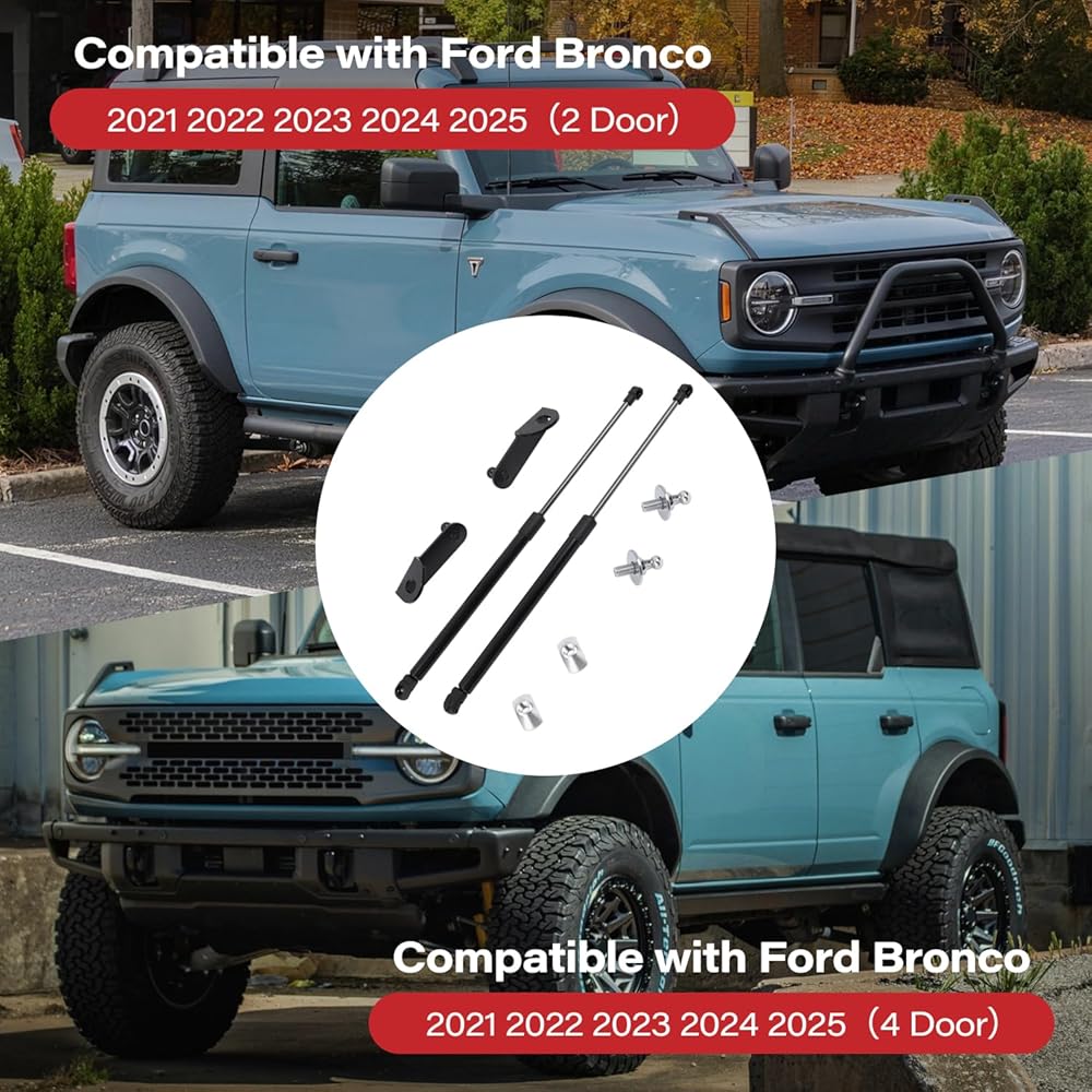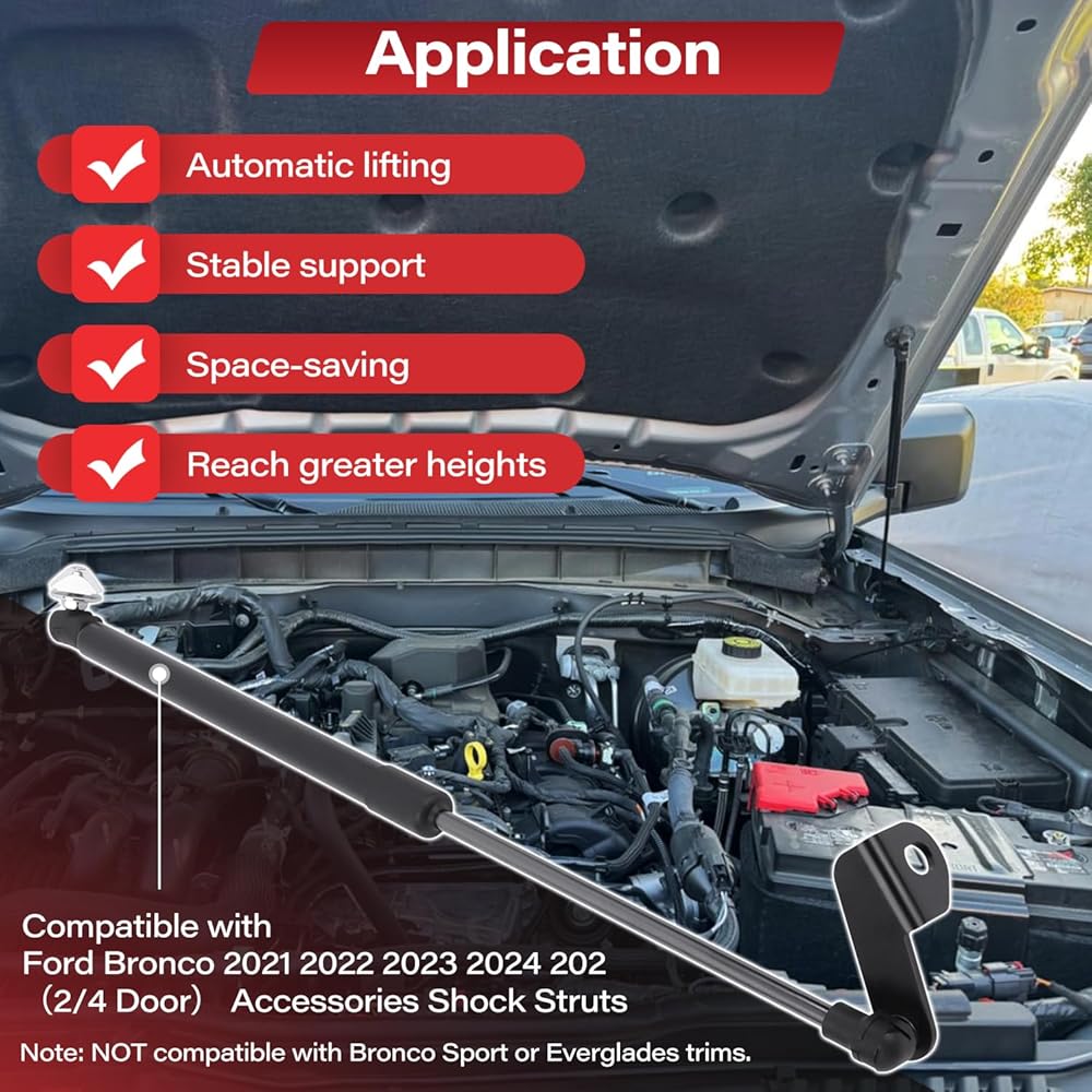 Compatibility: The hood quick lift strut is compatible with Ford Bronco 2021, 2022, 2023, 2024, 2025 (2-door/4-door) hood struts. Please note that this hood support strut is not compatible with the Bronco Sport model