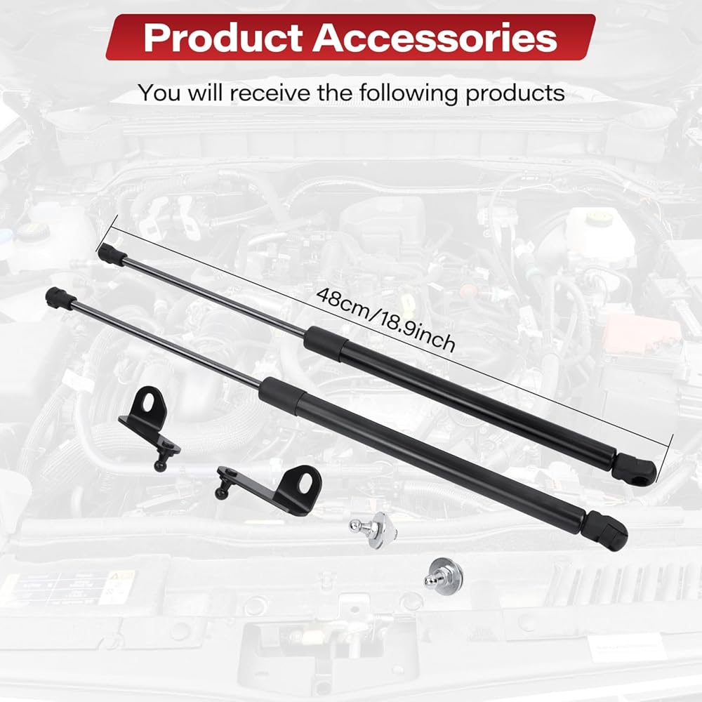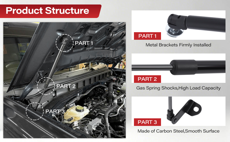 Easy Installation: No drilling required. Our hood struts utilize factory mounting points to ensure precise hood alignment. Bolt-on hood struts enhance efficiency during vehicle maintenance and improve reliability, making them an essential tool for your garage