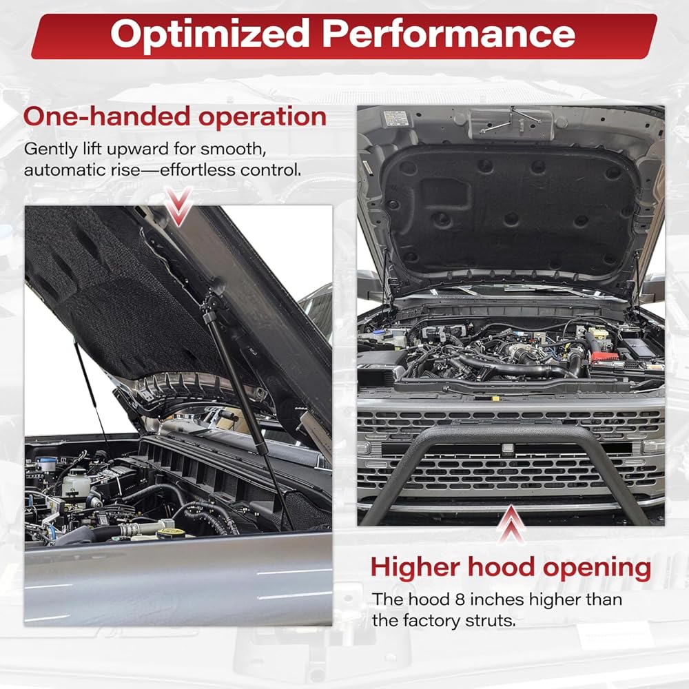 Features: One-handed operation—simply begin pulling upward, and the hood will lift smoothly and controllably on its own, making the process easier and more convenient.Higher hood opening—our hood lift support system raises the hood 8 inches higher than the factory hood struts
