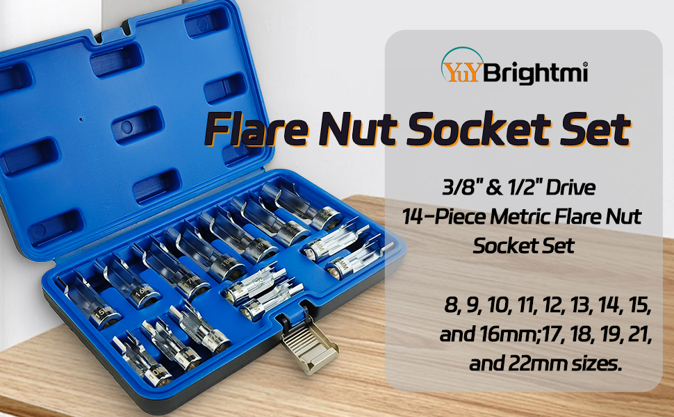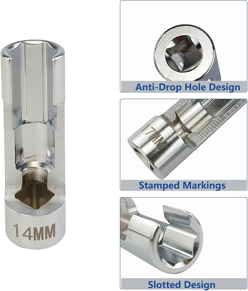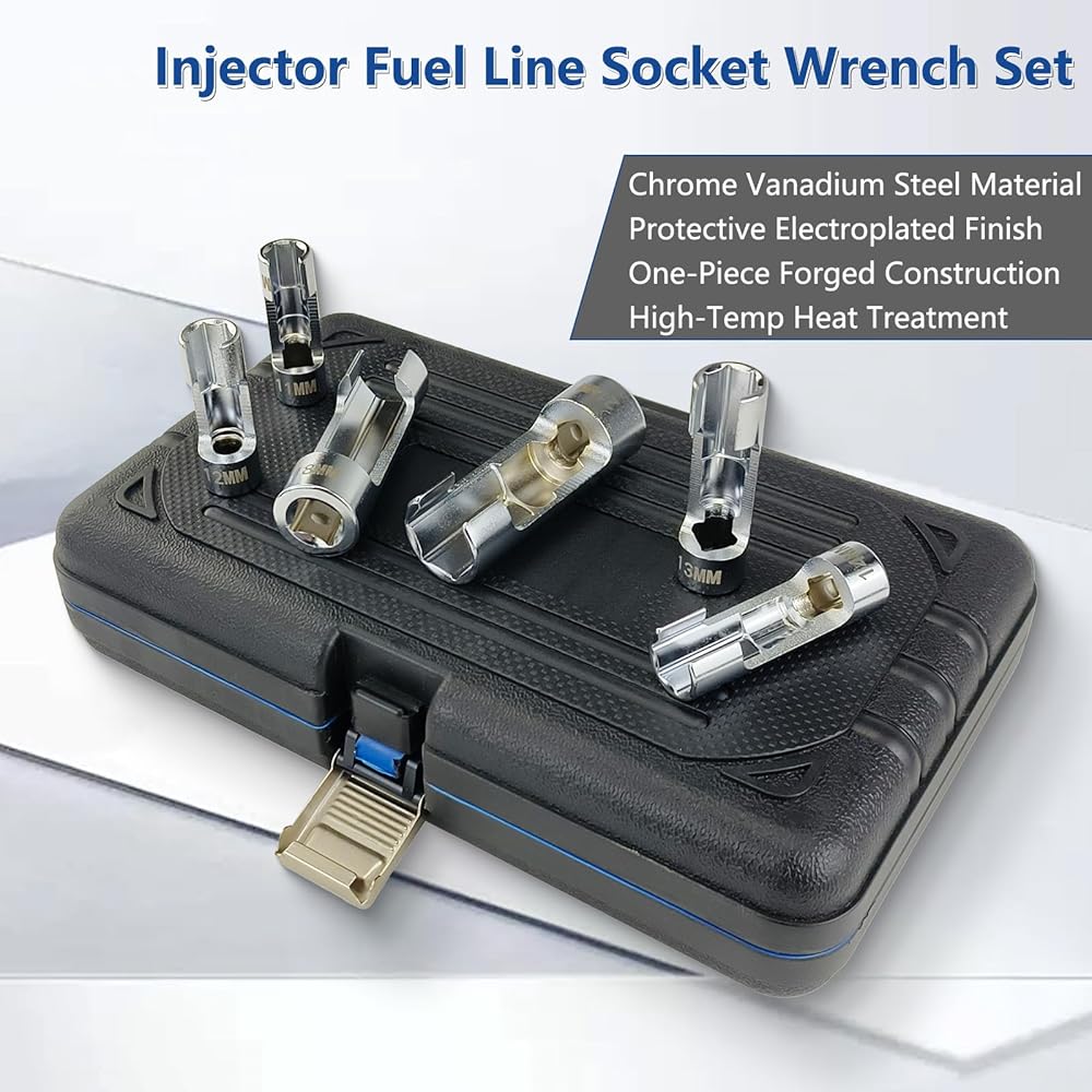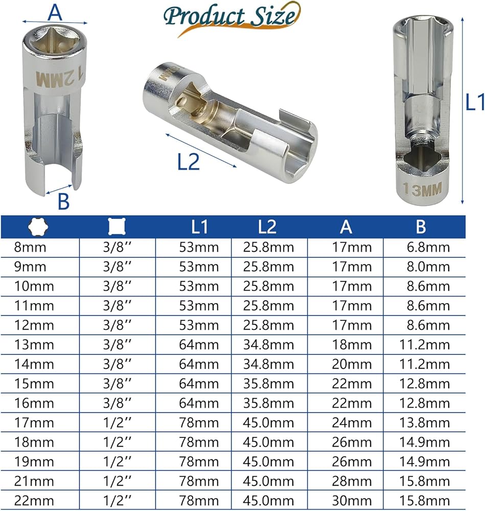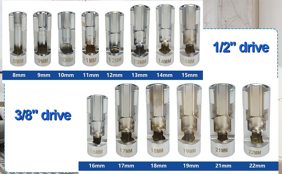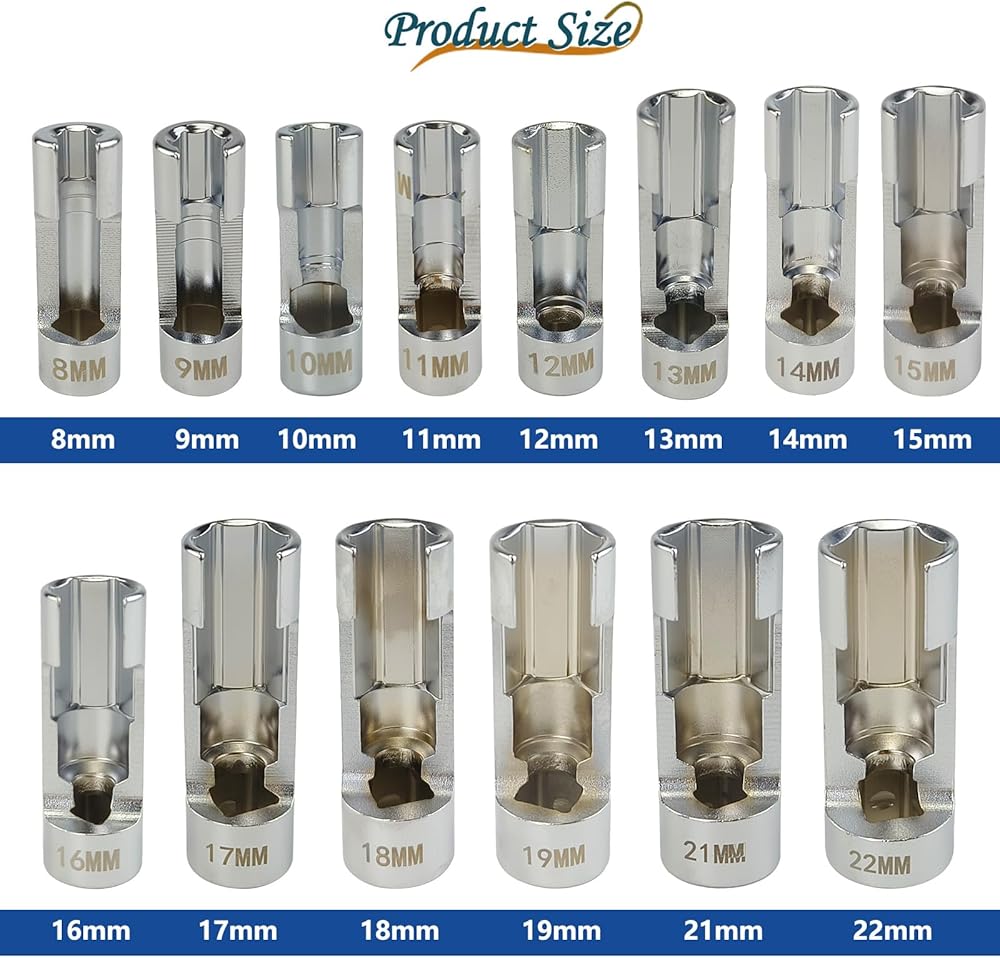 【Complete 14-Piece Metric Set】: This diesel injector socket set includes both 3/8" and 1/2" drive sizes for full coverage. The 1/2" drive sockets include 8, 9, 10, 11, 12, 13, 14, 15, and 16mm. The 3/8" drive sockets include 17, 18, 19, 21, and 22mm sizes.