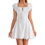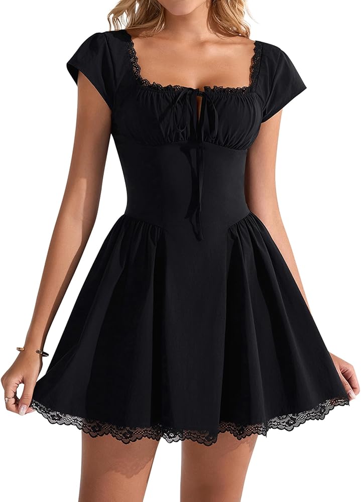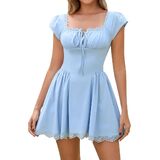 FEATURES: Lace, A line dresses for women, short dress for women, fit and flare dress for women, knee length dress for women, square neck, cap sleeve, tie front
