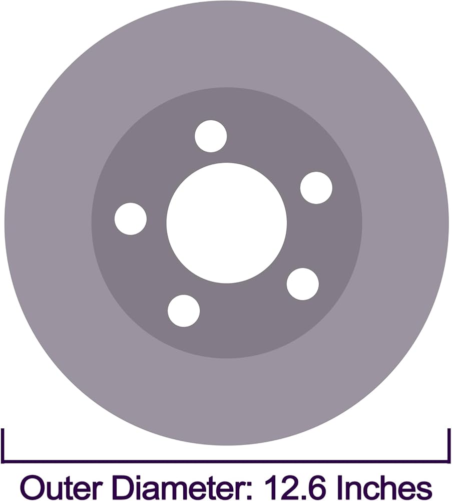 Brake Rotor Specifications: Position: Front Driver Side and Passenger Side / Rotor Type: Vented / Outside Dia: 12.6 in / Hub Holes Centering Dia: 2.83 in / Mounting Bolt Hole Quantity: 5 / Bolt Circle Dia: 4.5 in / Bolt Dia: 0.55 in