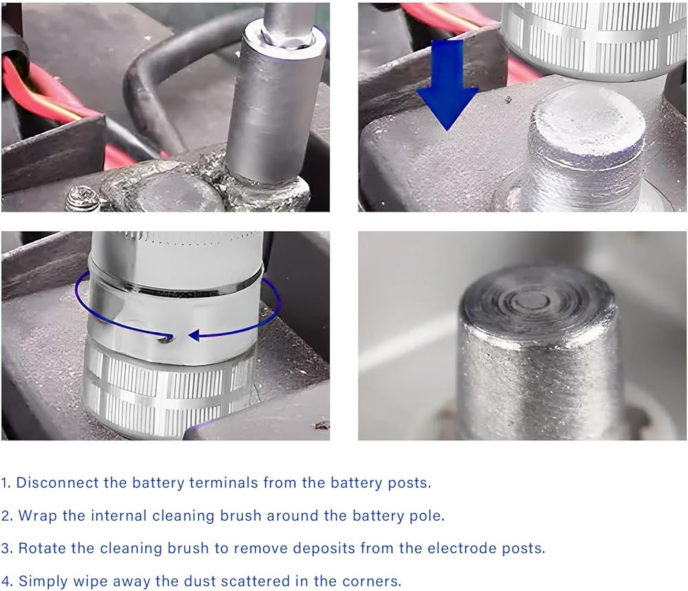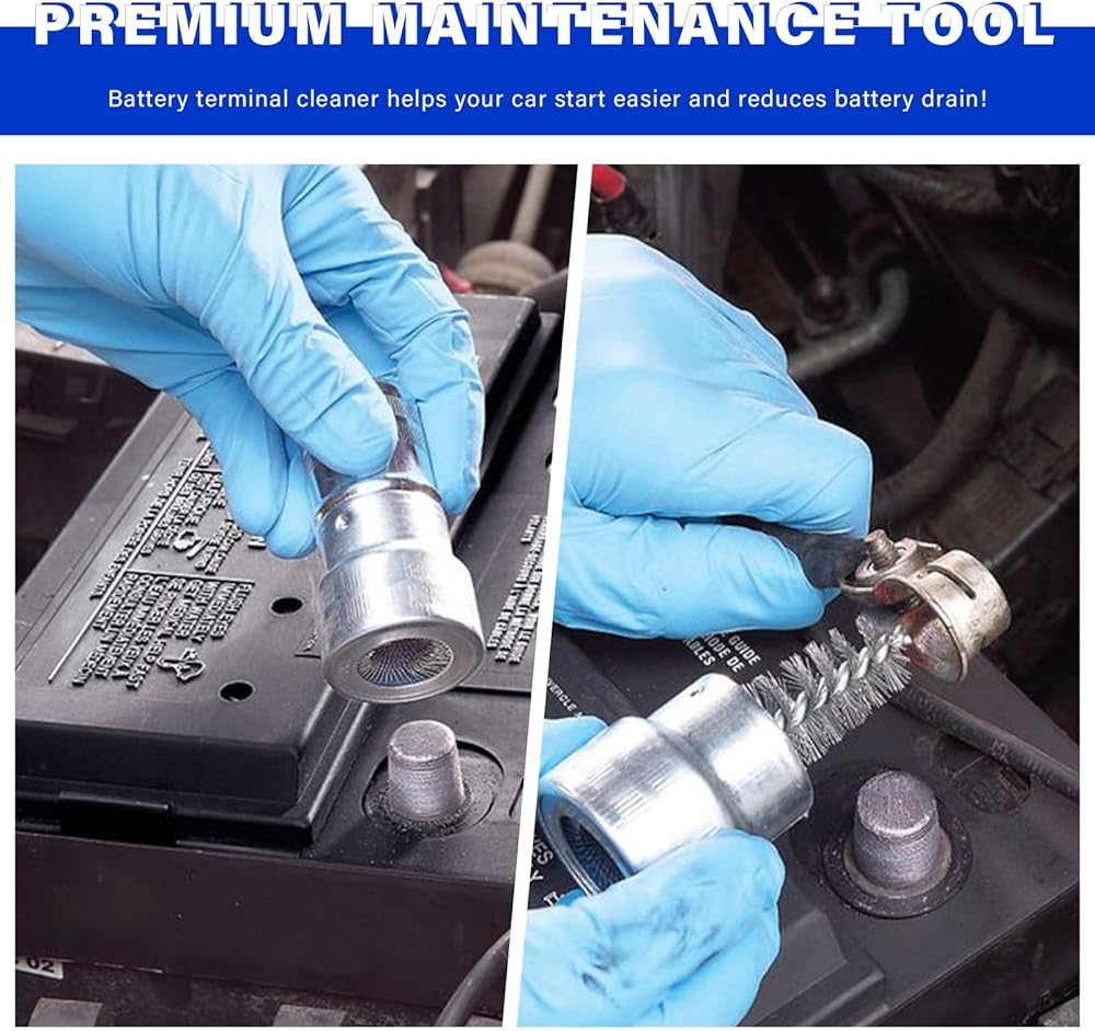 Unique Design: The cleaning tool features a dual-head design for versatile cleaning: the upper brush cleans terminals, while the lower one targets battery posts. Simply choose the suitable end based on the need to quickly and effectively remove rust and buildup