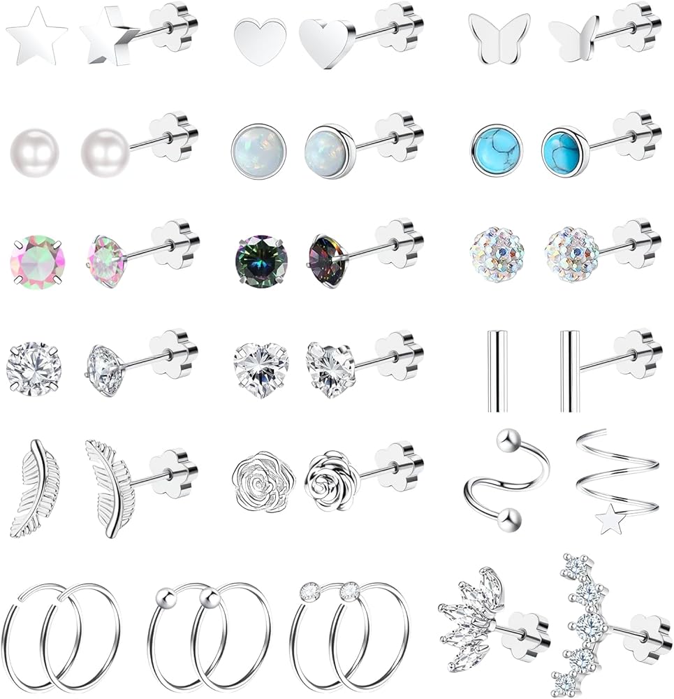 38pcs Silver Flat Back Stud Earrings for Women Hypoallergenic Surgical Steel Stud and hoops Earrings for Sensitive Ears Stacked Tiny Screw Backs Cartilage Tragus Earring Set for Multiple Piercing
