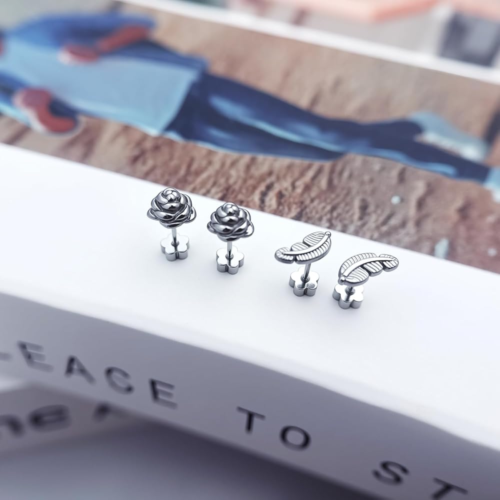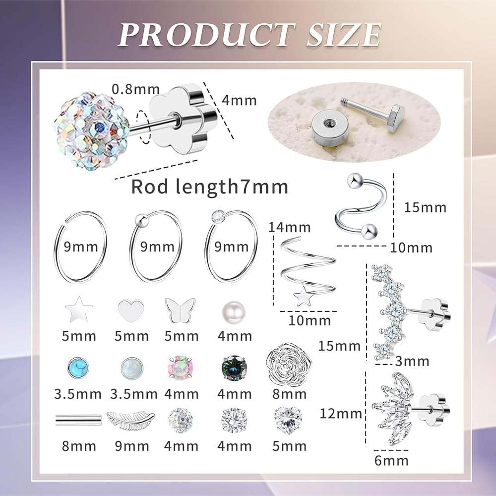 Silver Flat Back Earring Sets: Surgical steel earring set includes 30 pcs screw back searrings, 6 pcs cartilage earrings and 2 pcs ear cuff to meet your daily needs. These tiny stud earrings are fashionable and lovely, and can be perforated in a variety of ways, such as cartilage earrings, spiral perforations, first holes, second holes, third holes, tragus perforations, etc., to match your style at will